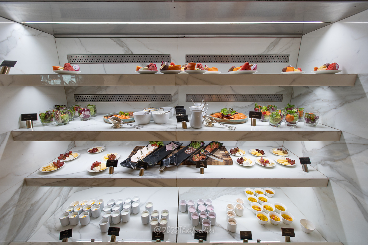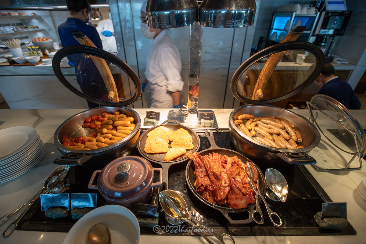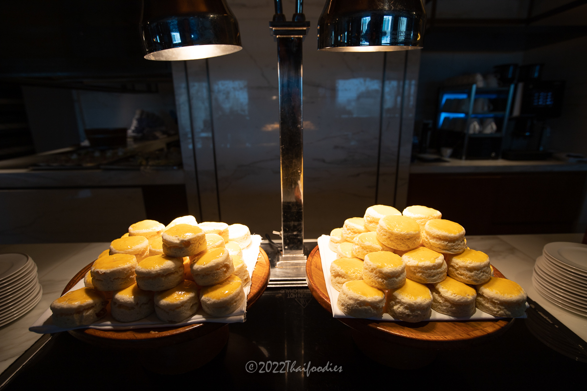 There are many kinds of food in buffet line including egg station, sausages, hash browns, deep fried bacon, ham, cold cuts, smoked salmon, yogurt, bakery goods, fresh fruits, coffee and tea.