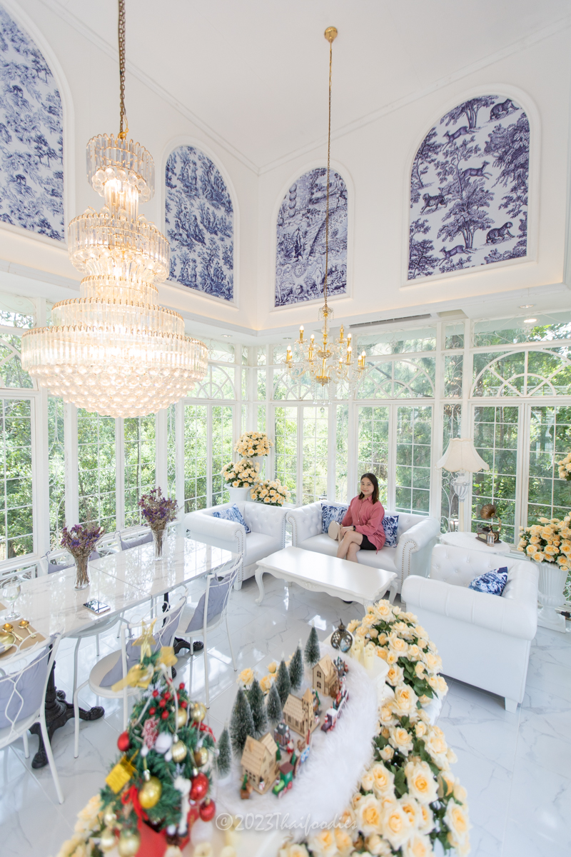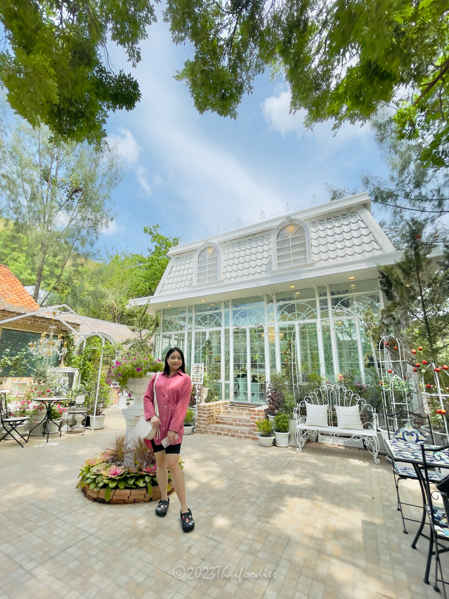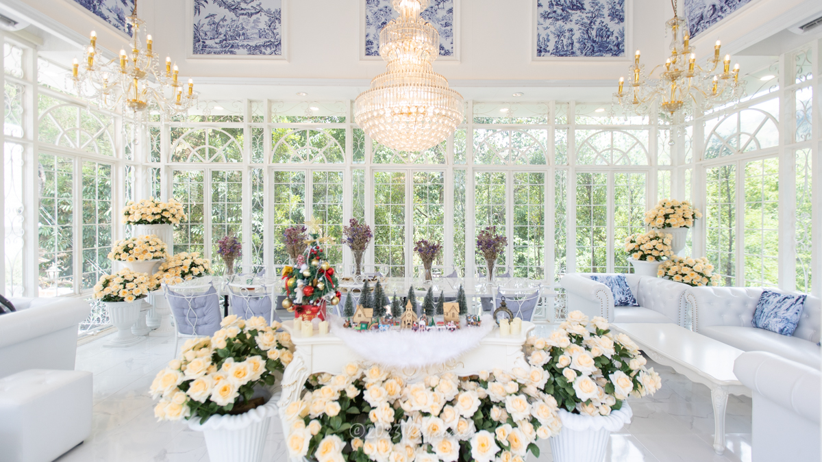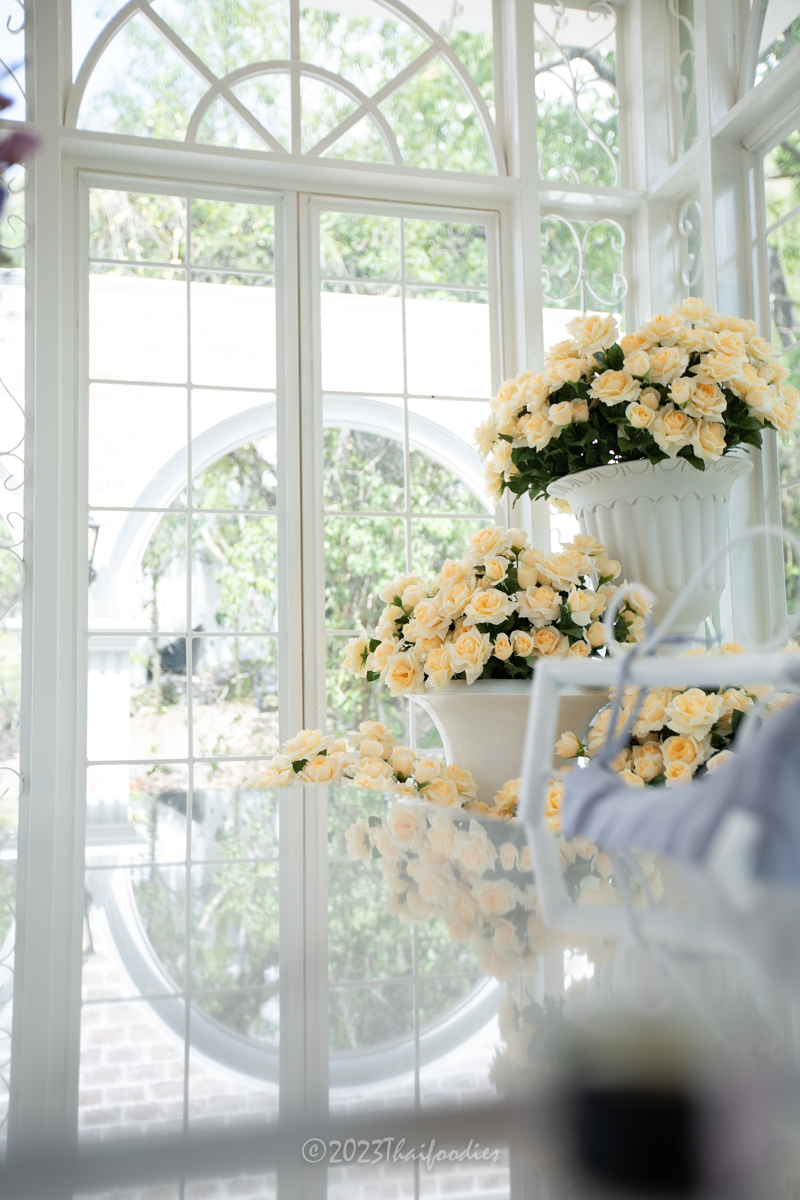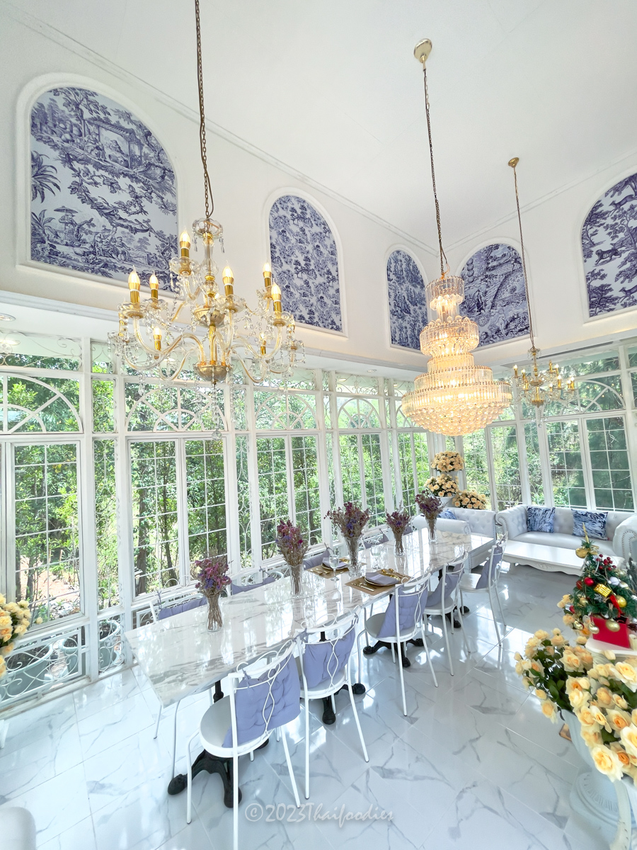 The atmosphere is beautiful scenery mountain of Suanpheung Ratchaburi, has a nice ambience. The glass house decorations with flowers and elegant chandelier light. These interior ideas the owner get inspiration by France.