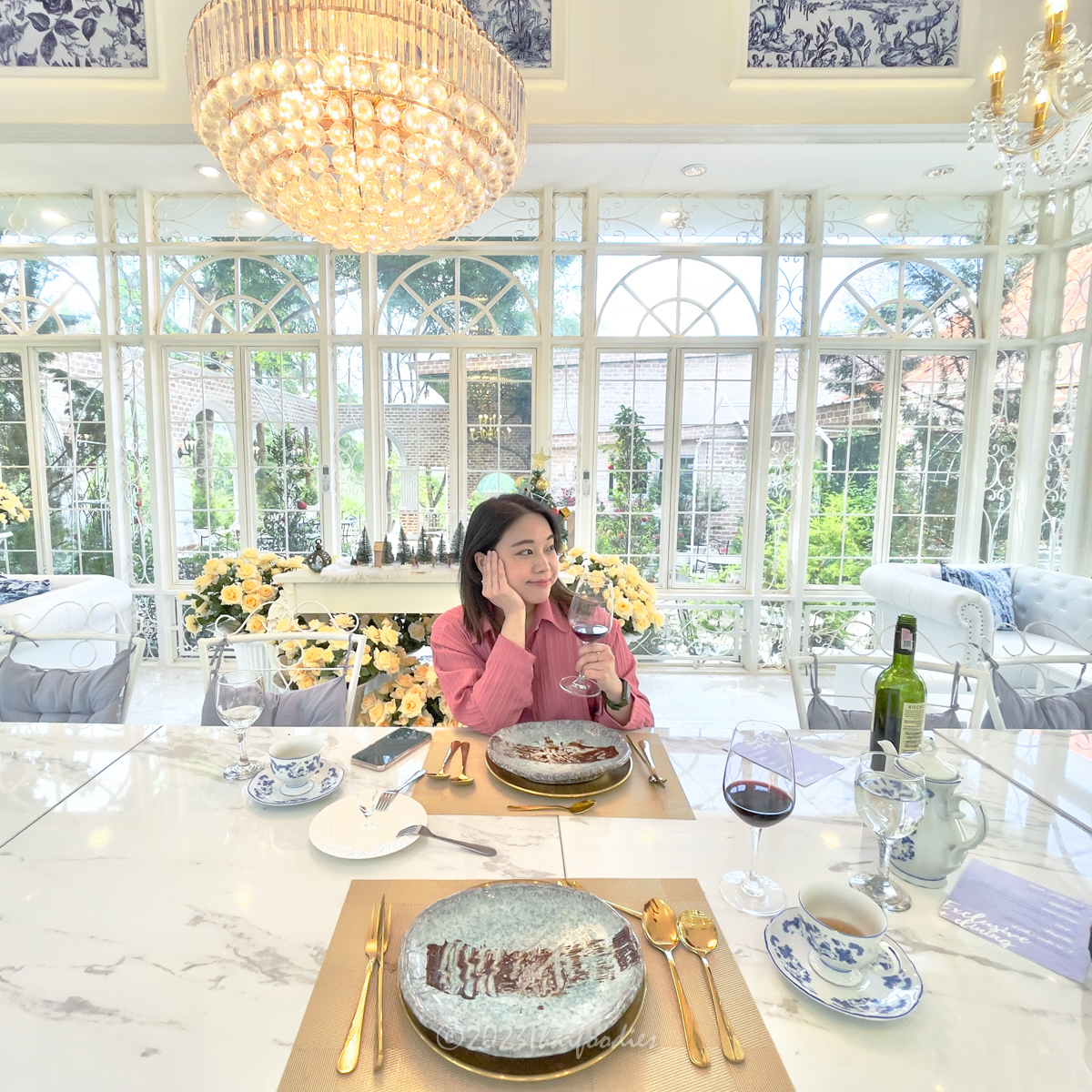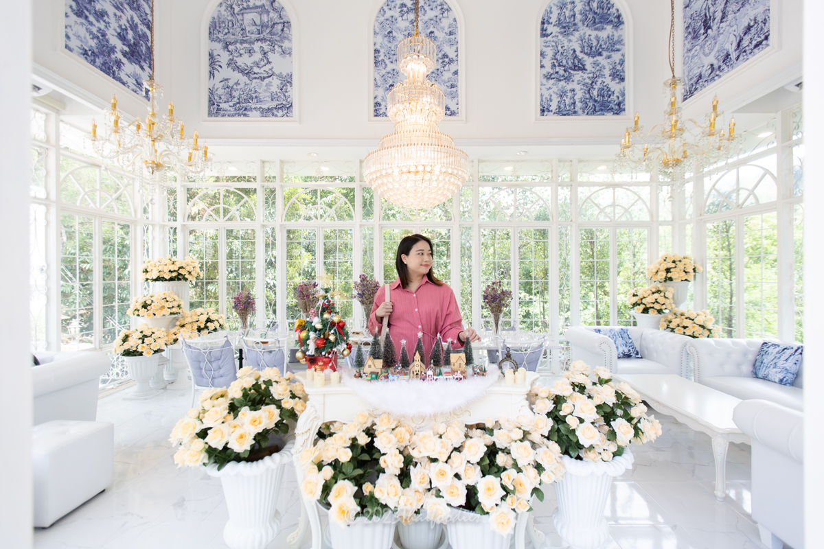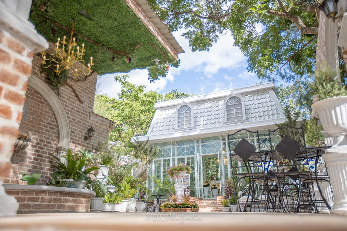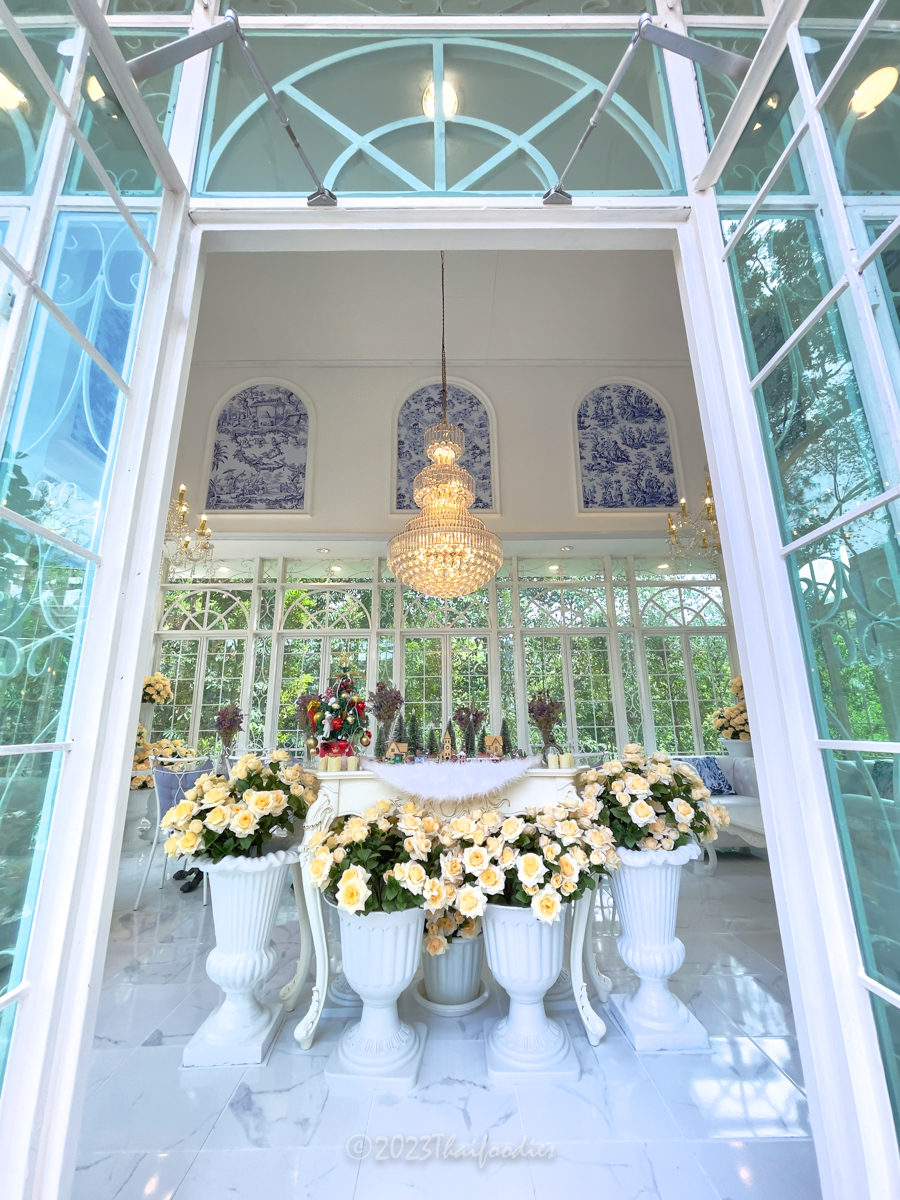 The atmosphere is beautiful scenery mountain of Suanpheung Ratchaburi, has a nice ambience. The glass house decorations with flowers and elegant chandelier light. These interior ideas the owner get inspiration by France.