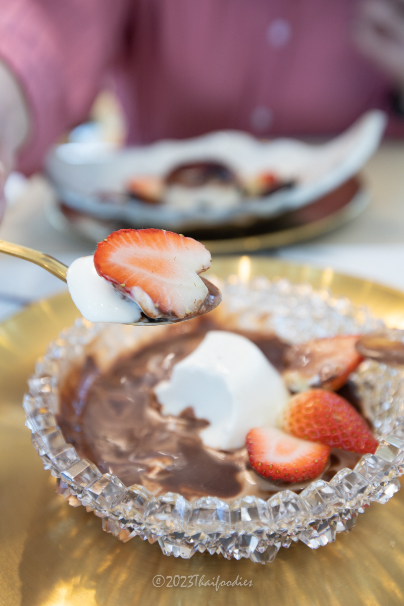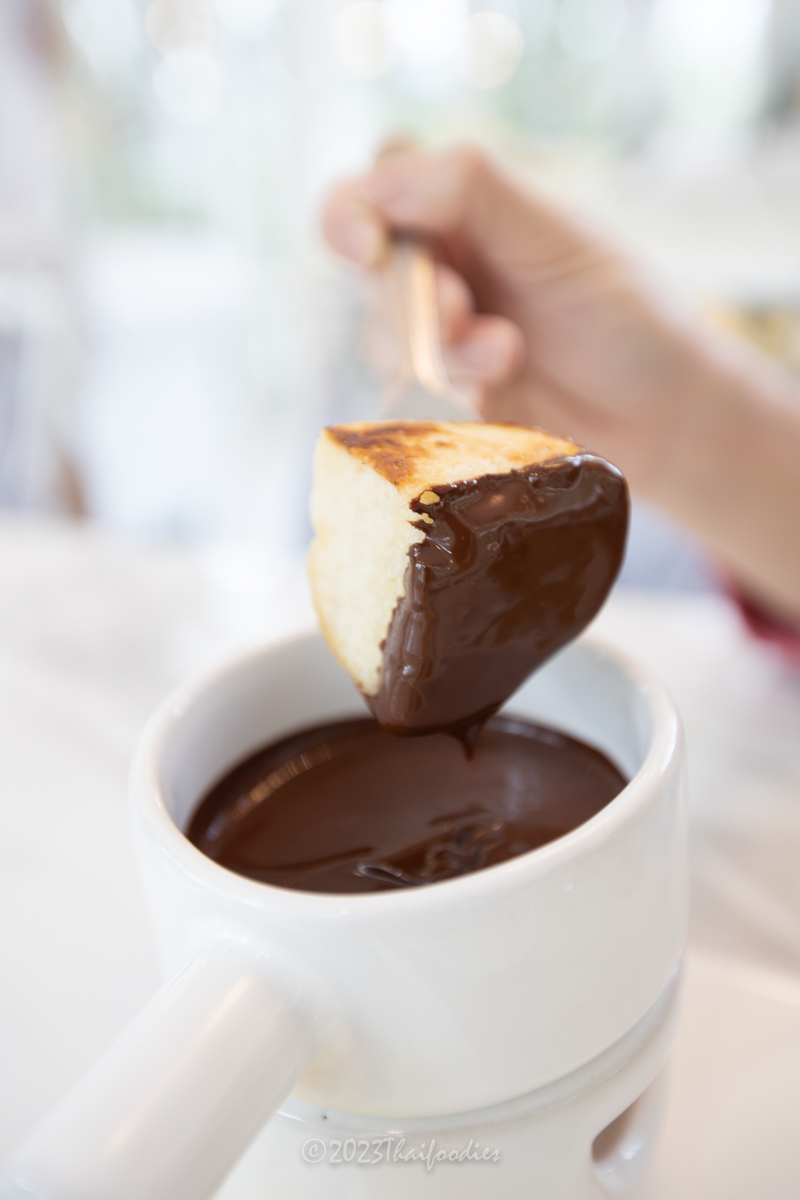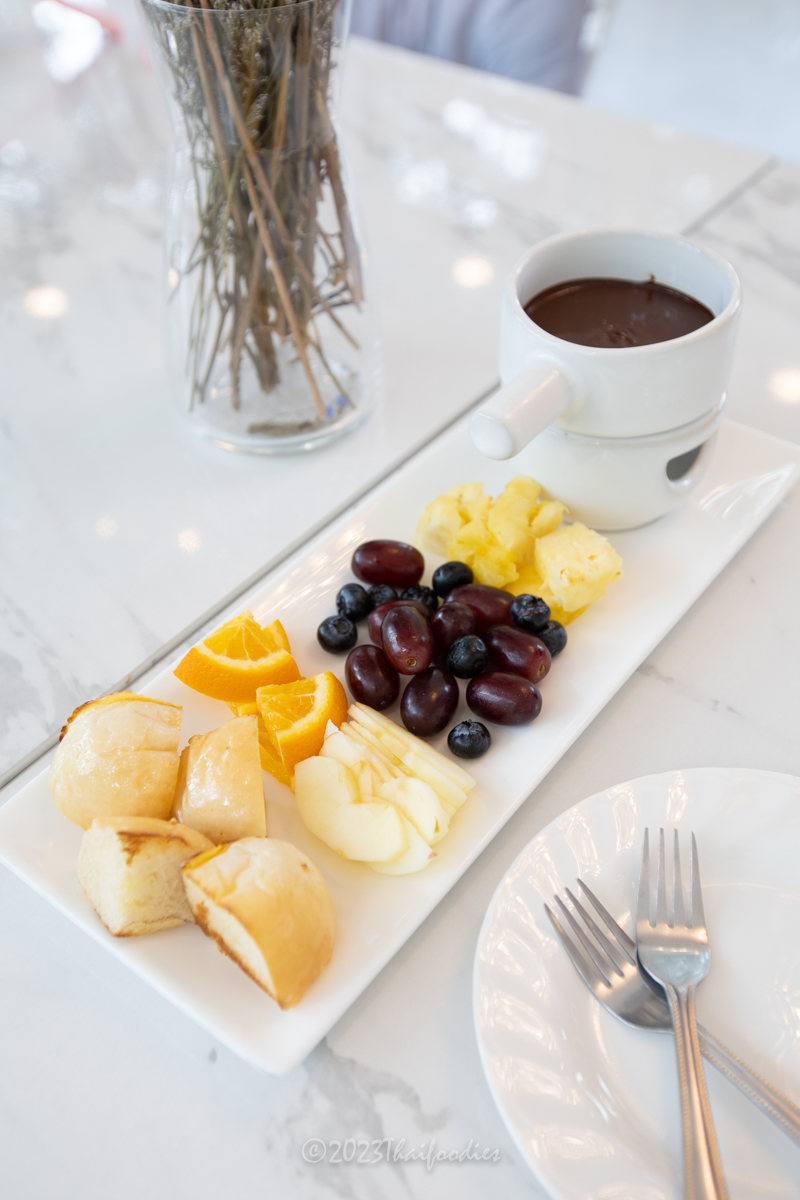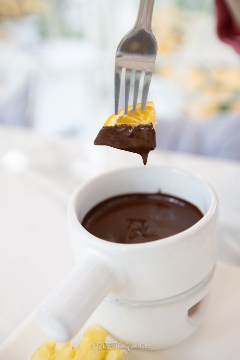 - Chocolate fondue - Homemade cacao conche by chef over 78 hours! Served in a hot ceramic pot, the chocolate is very intense and flavorful, served along with fresh Ratchaburi pineapples, oranges, strawberries, grapes, apples, and homemade brioche bread. We dipped everything with quality chocolate. The taste is totally amazing and yummy!