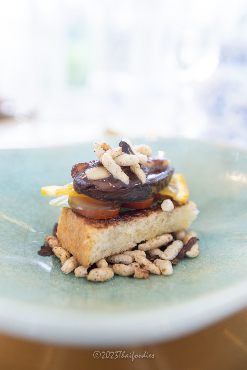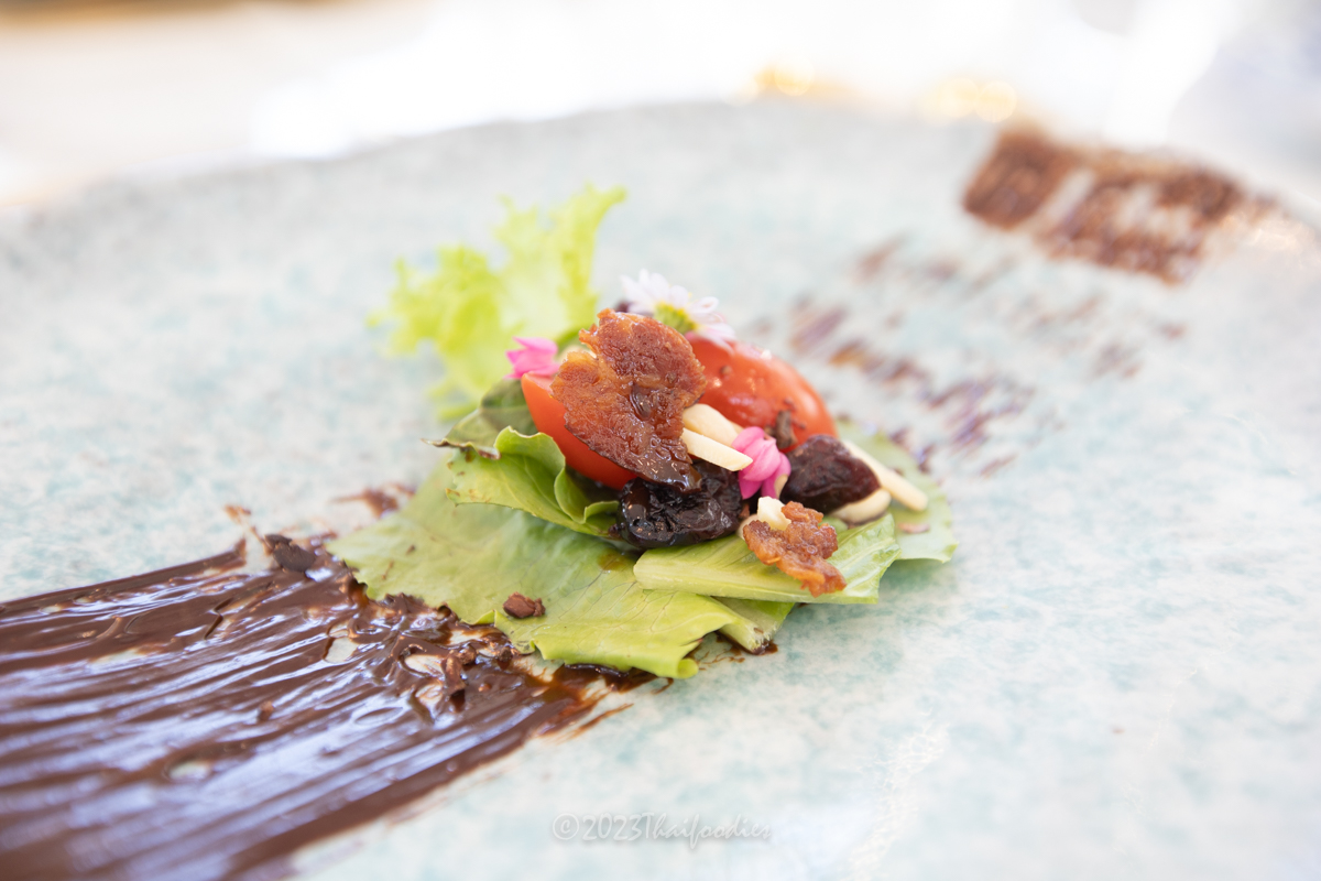 We were very impressed by Chef Specialty's homemade blended chocolate from Thailand's local products, from many provinces that can grow Theobroma cacao well, such as Nongkai, Phitsanuloke, Korat and Chantaburi. This cocoa has a different taste. Chef Aeh (Pannasorn Patamapinunt), owner of Morning glory The bakery house, blended and mixed cacao in her recipes, and the flavor is really good. She blended cacao wine, cacao tea, and hot chocolate. Here is a quick look at the delights of the 6-course chocolate fine dining experience- Sparkling cocoa wine - The taste is like rose wine, easy to drink and good to start opening your taste buds!