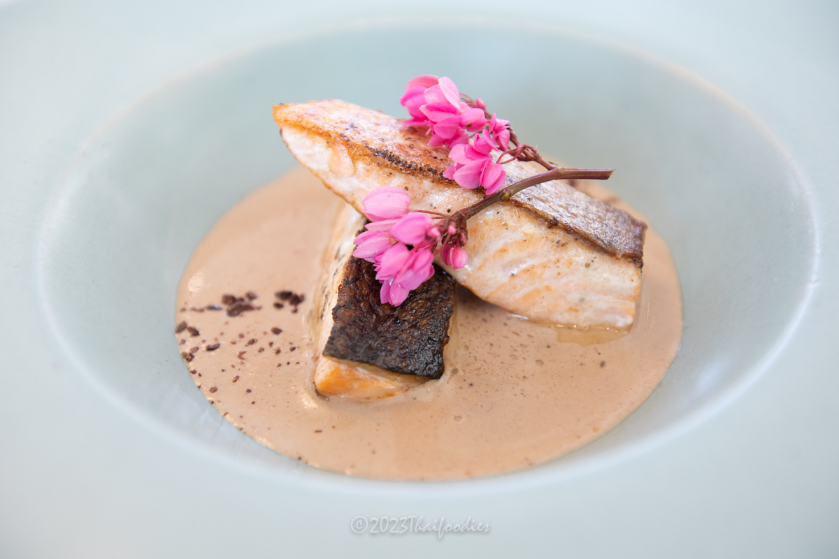 - Pan-seared Salmon Fillet with Chocolate miso sauce - Perfectly cooked salmon, the skin is crispy and the salmon meat is juicy and tender with a beautiful pink color. The chocolate mixed with miso sauce is mild and delicious. Chef Aeh selects from Phitsanuloke province (the taste of cacao at Phitsanuloke is slightly salty) so it goes very well with this main course.