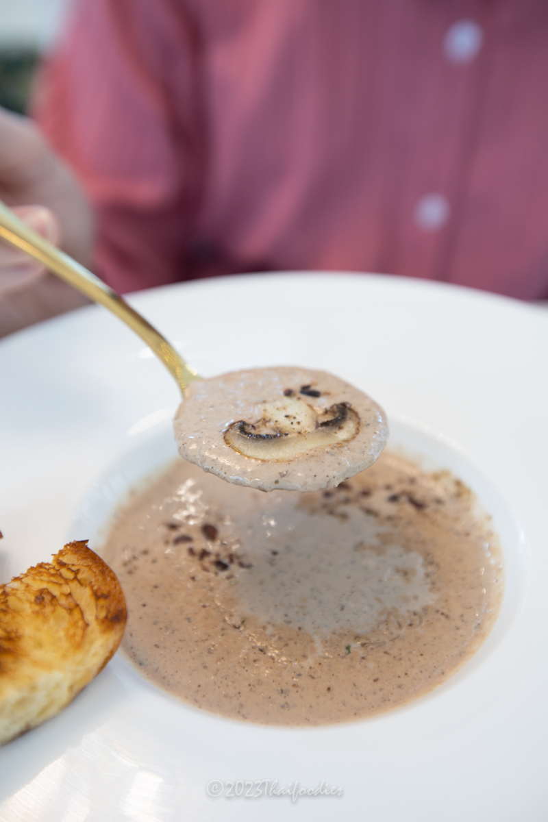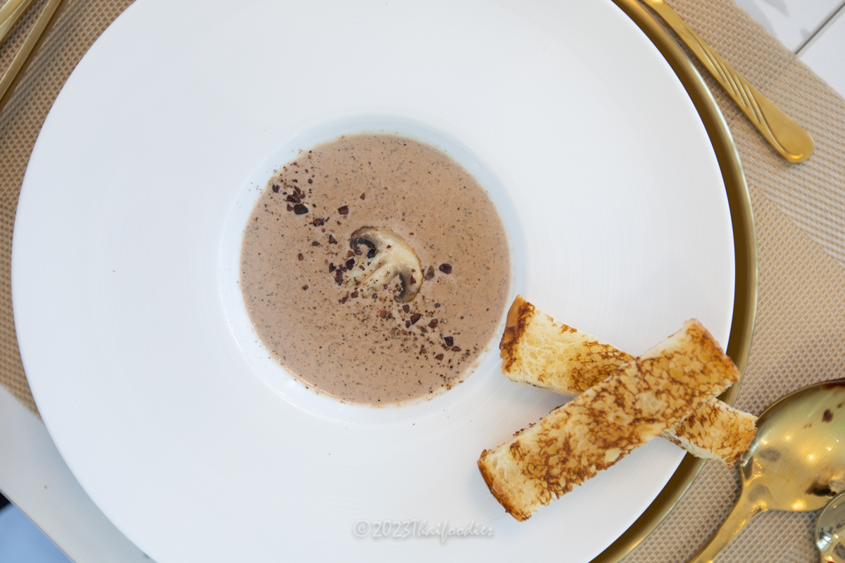 - Champignon mushroom soup - Chef blended with chocolate craft cream and topped with cacao nibs.