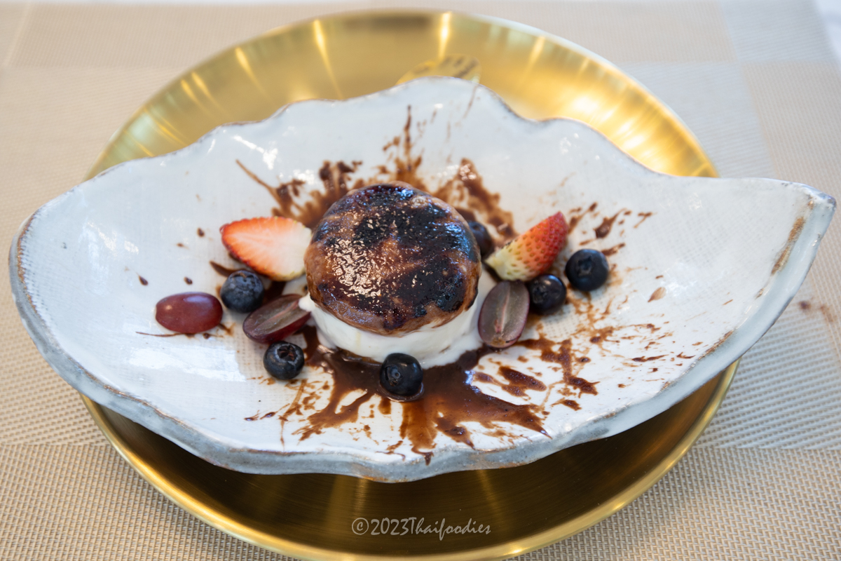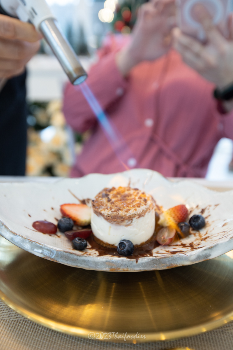 - Rare cheesecake on fire - Chef got the inspiration for this dessert dish from a voyage to Japan! 3 kinds of cheese mixed and served in a circle shape along with fresh strawberries and blueberries. This is the most delicious cheesecake in Ratchaburi! The chef caramelized the sugar on the top of the cheesecake, it was crispy on the top while the warm cheesecake melted in my mouth! A heavenly combination with fresh berries!