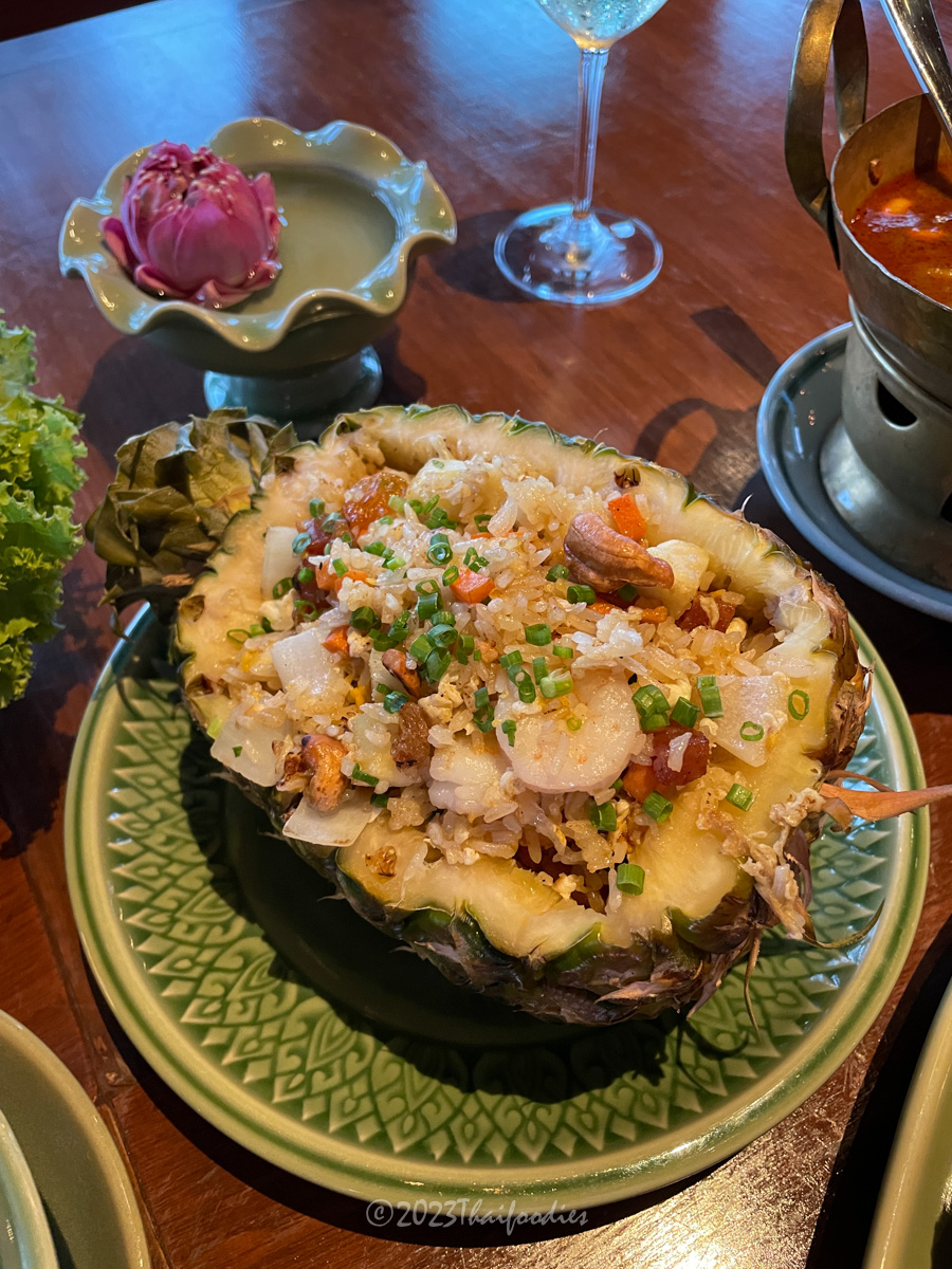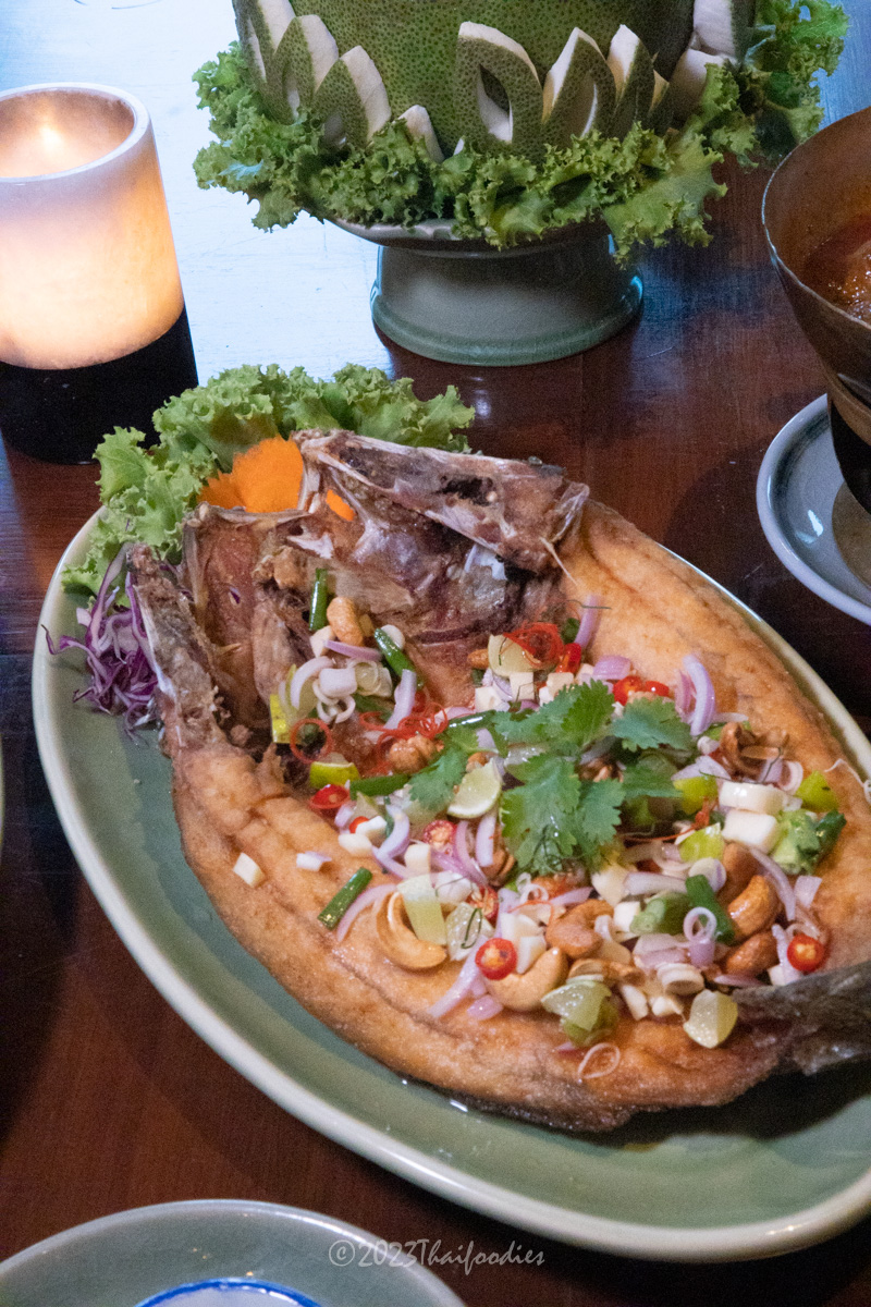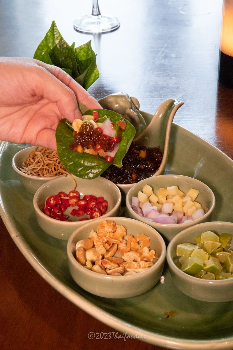 We tried Miang kam (betel leaves with red onions, peanut, fresh chili, lime, dried coconut, dried shrimp, and sweet sauce), Massaman beef curry, Roasted duck curry, Pineapple fried rice, Pomelo spicy salad, and Deep-fried sea bass topped with Thai herbs.
