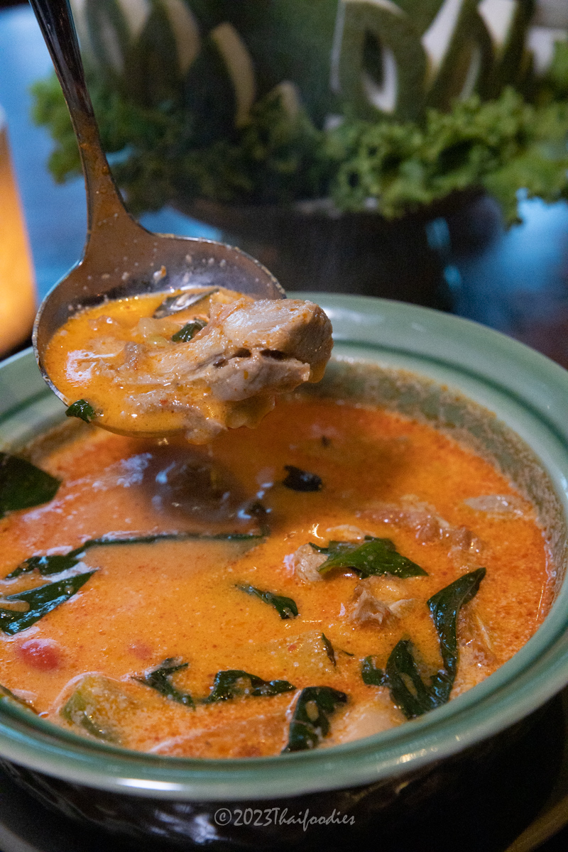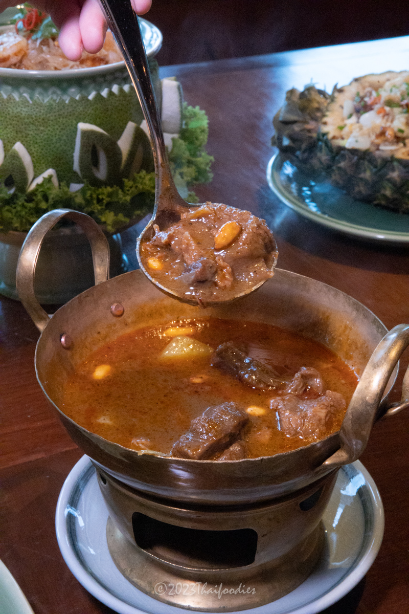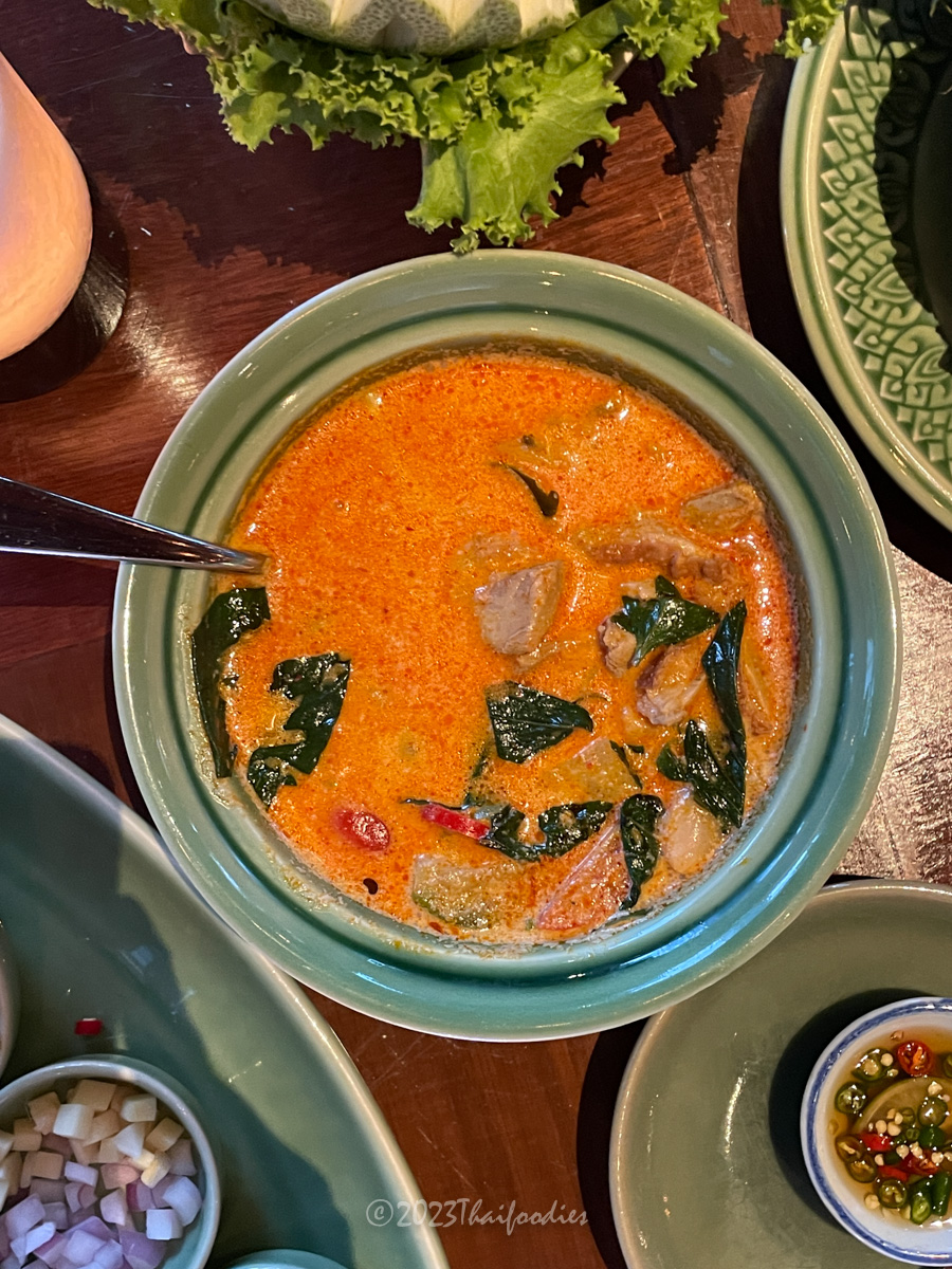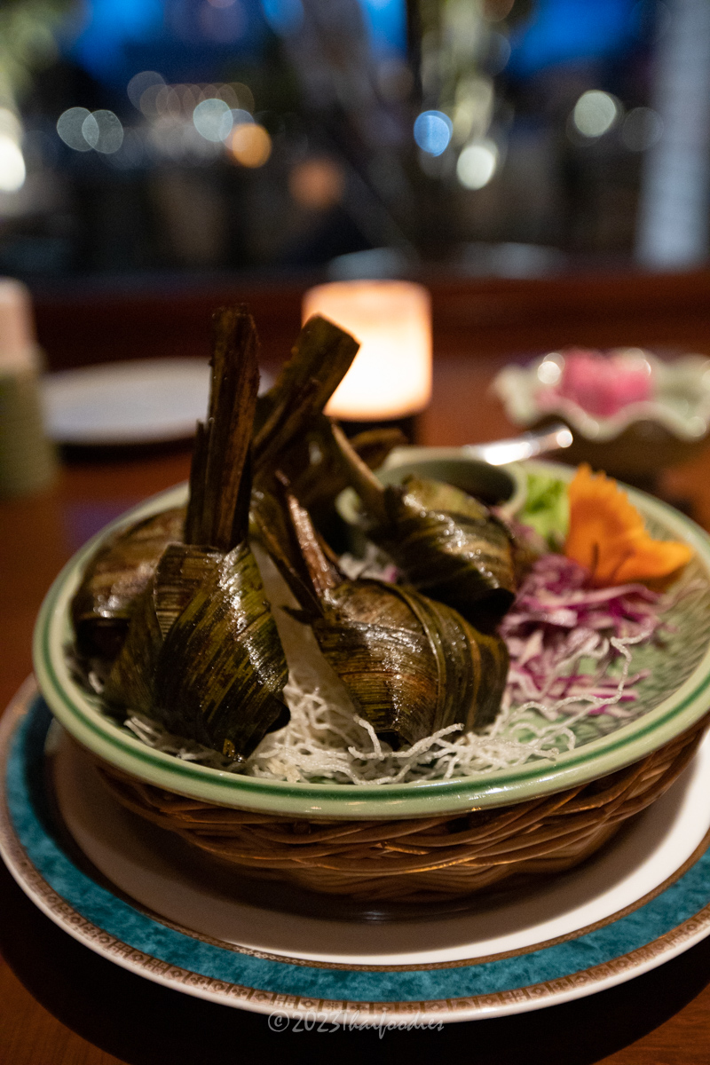 We tried Miang kam (betel leaves with red onions, peanut, fresh chili, lime, dried coconut, dried shrimp, and sweet sauce), Massaman beef curry, Roasted duck curry, Pineapple fried rice, Pomelo spicy salad, and Deep-fried sea bass topped with Thai herbs.