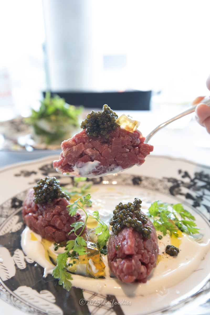 -Beef tartare, Buffalo milk yoghurt, Oscietra caviar, and chicken consommé jelly.