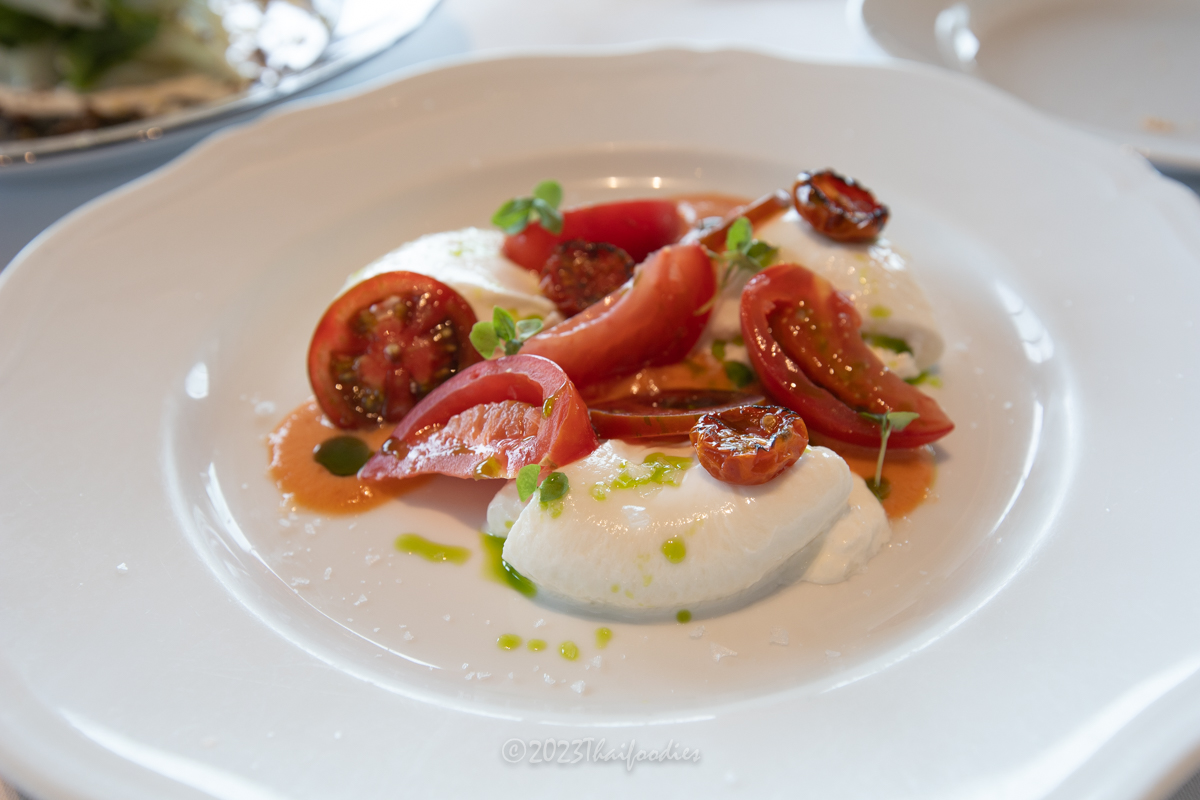 -Burrata, Panzanella emulsion, roasted cherry tomatoes, basil.