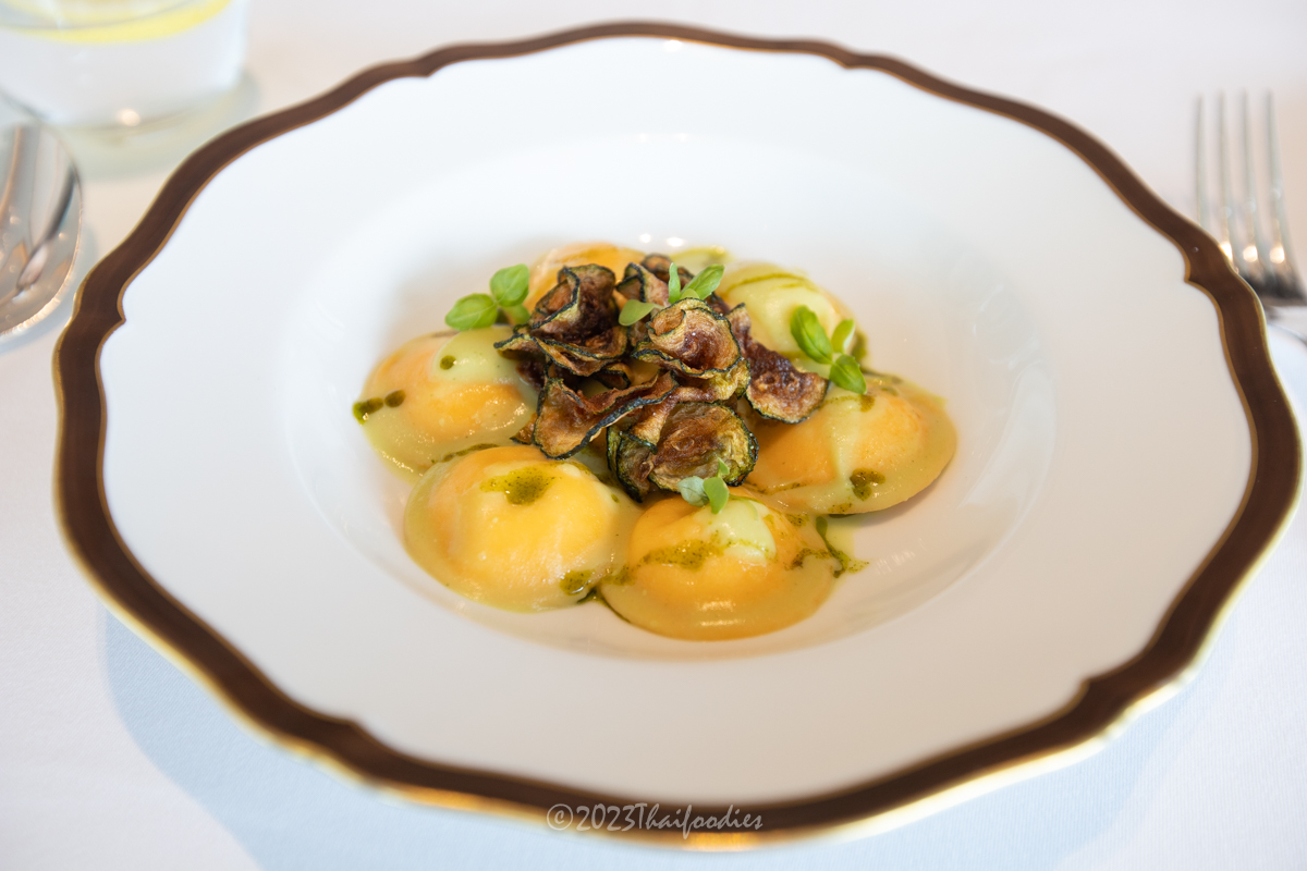 -Bottoni pasta stuffed with buffalo ricotta and mozzarella, Zucchini, and mint.