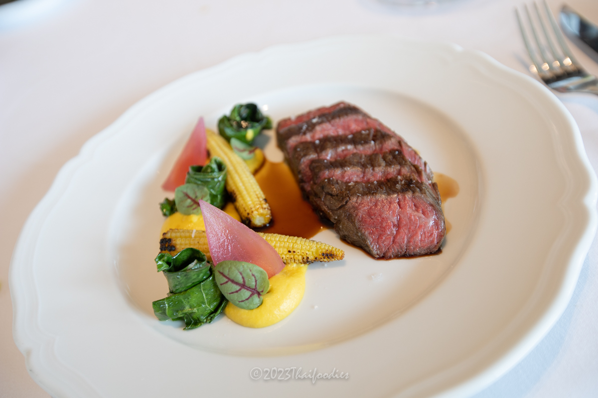 -Grilled Wagyu flank steak, Corn, Swiss chard, pickled tropea onion