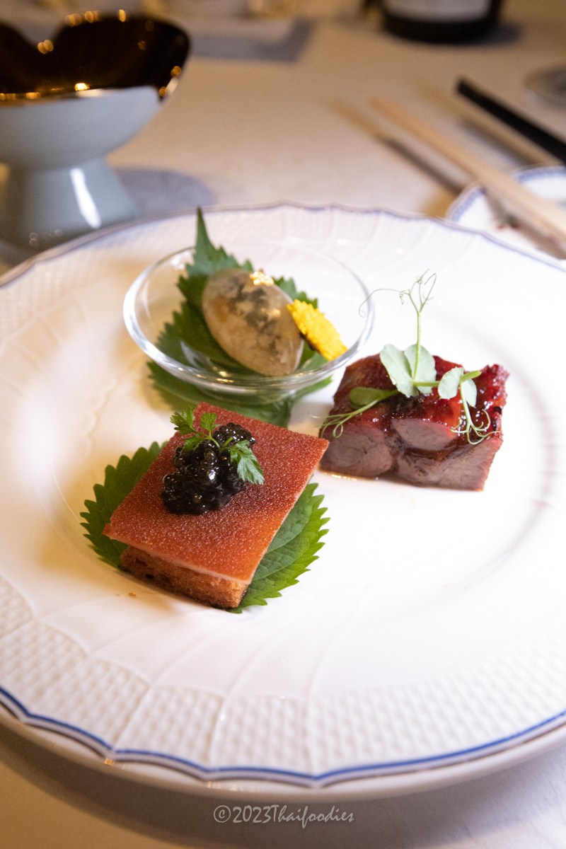 -Crispy suckling pig, Foie gras mouse. The Crispy pork is perfect taste to go with foie gras mouse and they top on a crispy bread the taste is super amazing flavor!