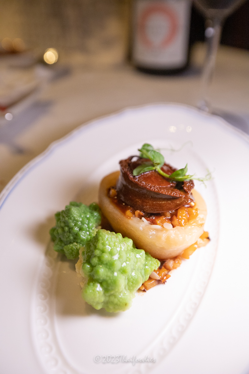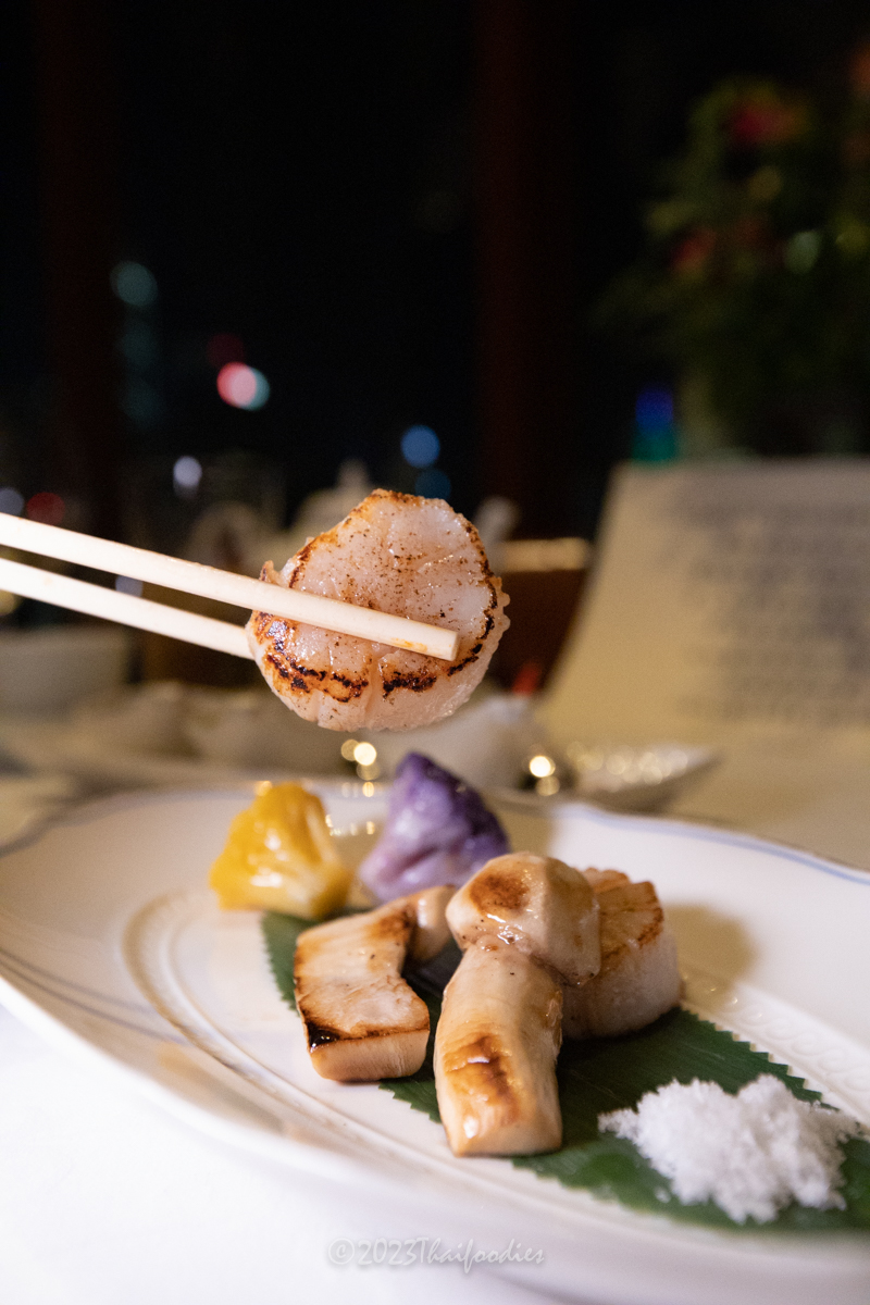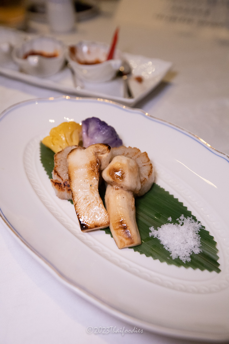 -Pan fried Hokkaido scallops, Matsutake mushrooms, Vegetable, and sea salts.
