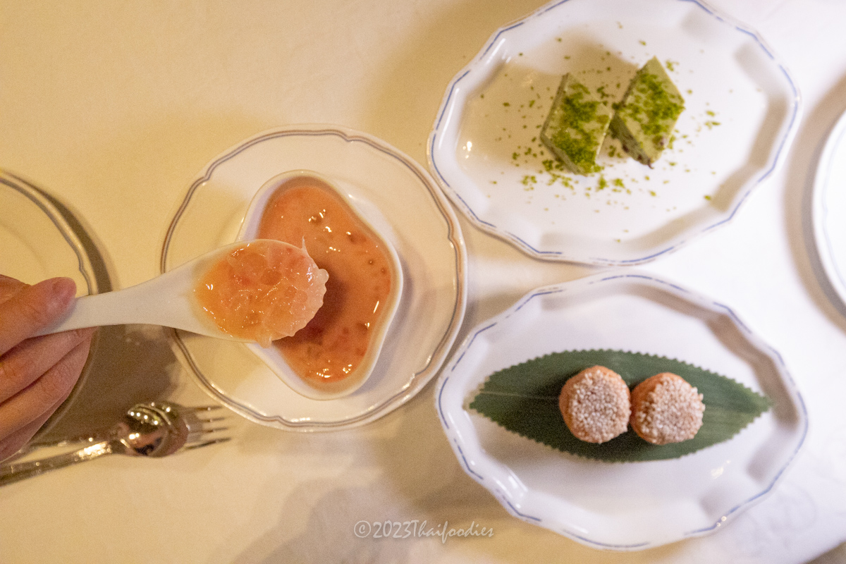 -Chilled sago cream, Guava, Aloe, Chilled pistachio pudding, Tokachi red bean, Deep fried fermented bean curd pastries, lotus paste.