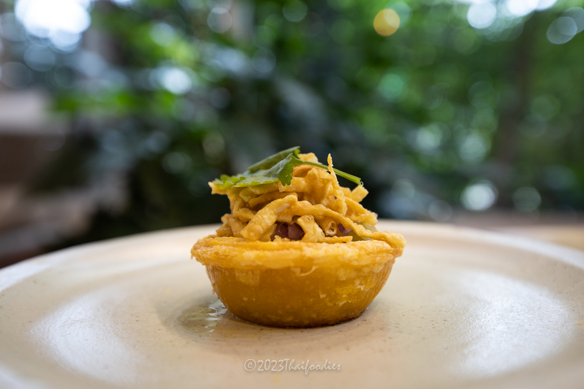 The Khao Soi Tart, a signature Northern Thai curry noodle soup dish, showcases a medley of flavors stemming from a blend of aromatic spices like turmeric, cumin, coriander, and chili peppers. Transformed into finger food for convenient consumption, it retains the original essence of this beloved Thai delicacy.