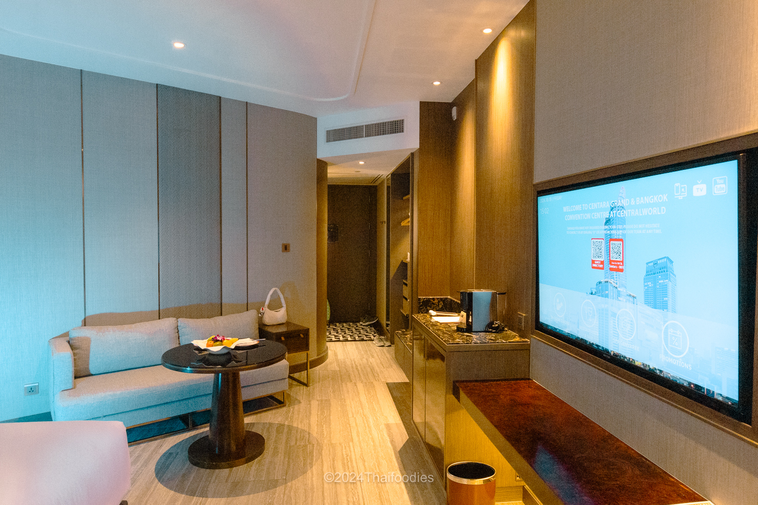 Weekday rates start at 4,920 THB, with access to exclusive Club benefits on the 51st floor, offering breathtaking panoramic city views. Guests can indulge in a variety of complimentary refreshments including tea, coffee, cocktails, mocktails, sparkling chrysanthemum tea, and more, along with an array of light snacks and comfort food options. Check-In and Room Features Check in conveniently on the 23rd floor, then settle into a spacious 39-square-meter room beautifully styled in gray, white, and black tones with elegant marble accents. Each room features a plush king-sized bed, a comfortable seating area, a work desk, and a sofa to unwind with stunning city views. Amenities include a large Smart TV, minibar, tea, coffee, and a capsule coffee machine, as well as a warm Welcome Fruit tray.