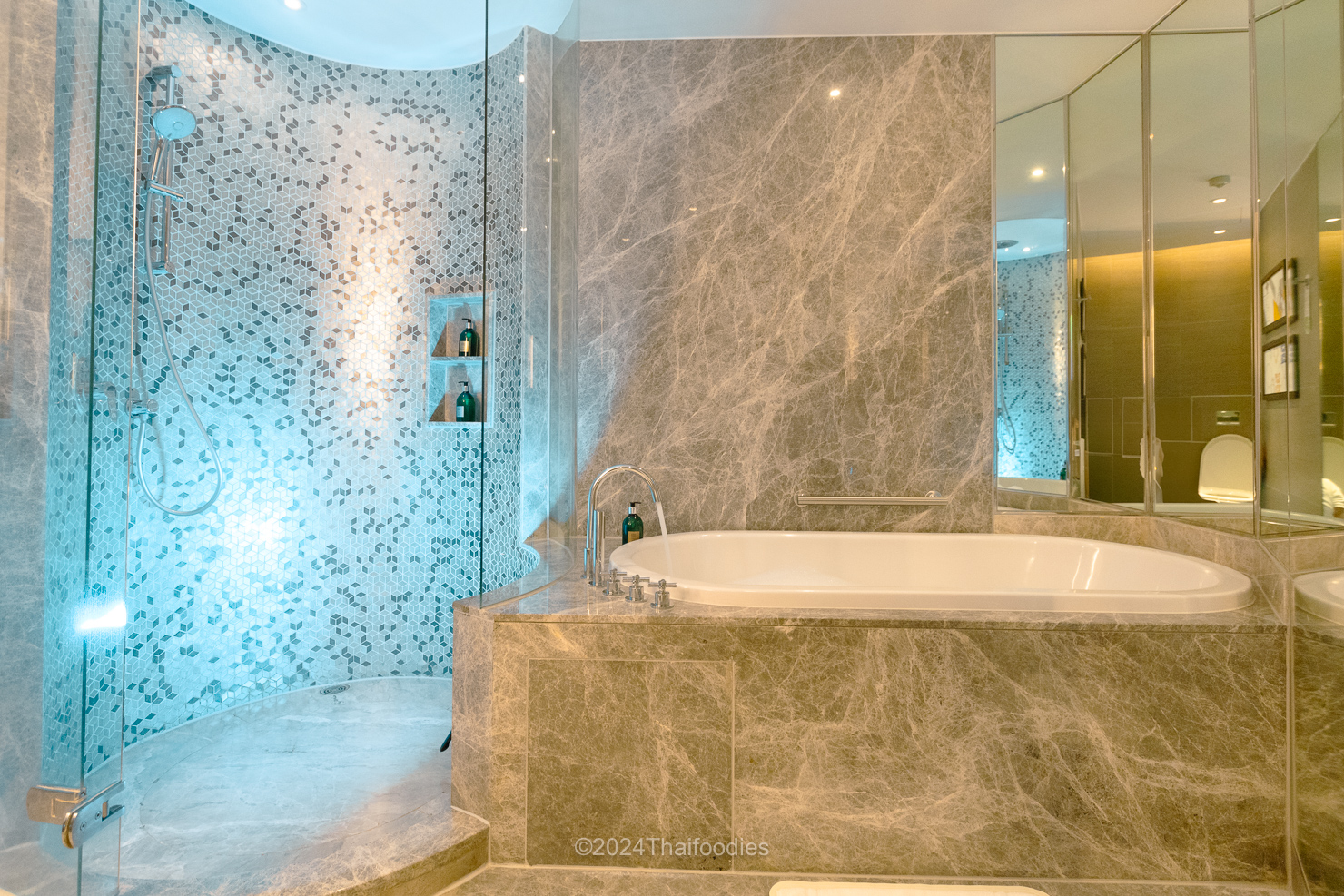 Enjoy your welcome drink on either the 54th or 56th floor. The expansive bathroom features a soaking tub and a circular shower, complemented by luxury amenities, including toiletries, bathrobes, and slippers. There’s also a complimentary laundry service for two items.