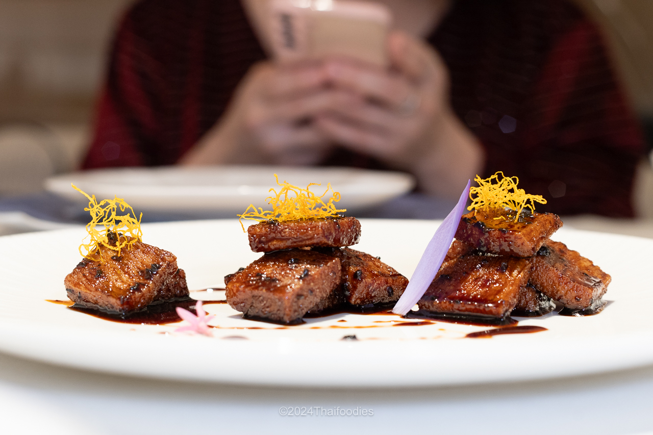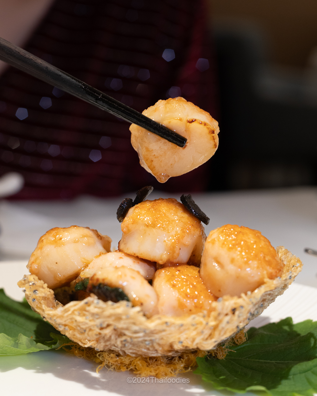 - Sautéed Scallops with Shrimp Mousse & Black Truffle Sauce:Shrimp mousse topped with plump, bouncy scallops, bathed in a rich truffle sauce. Served with crispy fried small fish at the base for added texture.