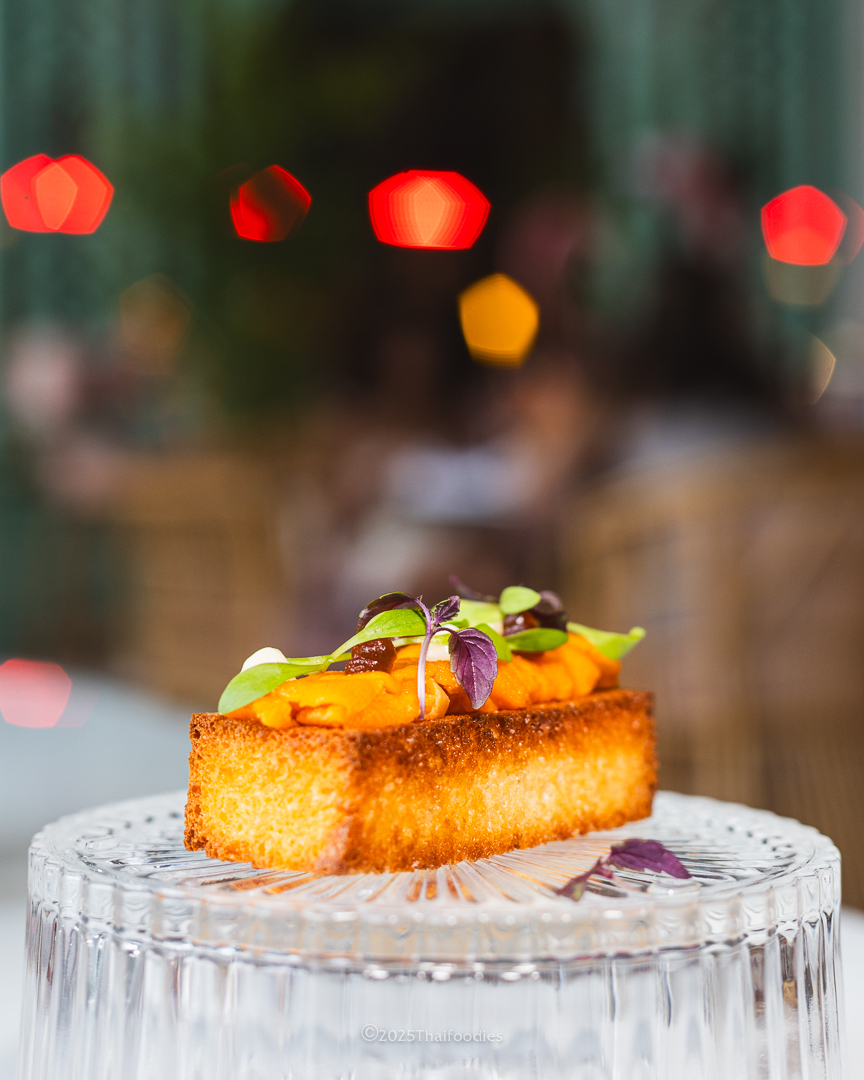 This dish is a showstopper. Made with three types of risotto rice for texture, and cooked in a rich lobster bisque, it’s packed with creamy, oceanic flavor. Topped with firm, succulent shrimp and spicy Spanish chorizo, the smoky paprika and umami notes take this risotto to the next level. Uni Toast – 420++ THB