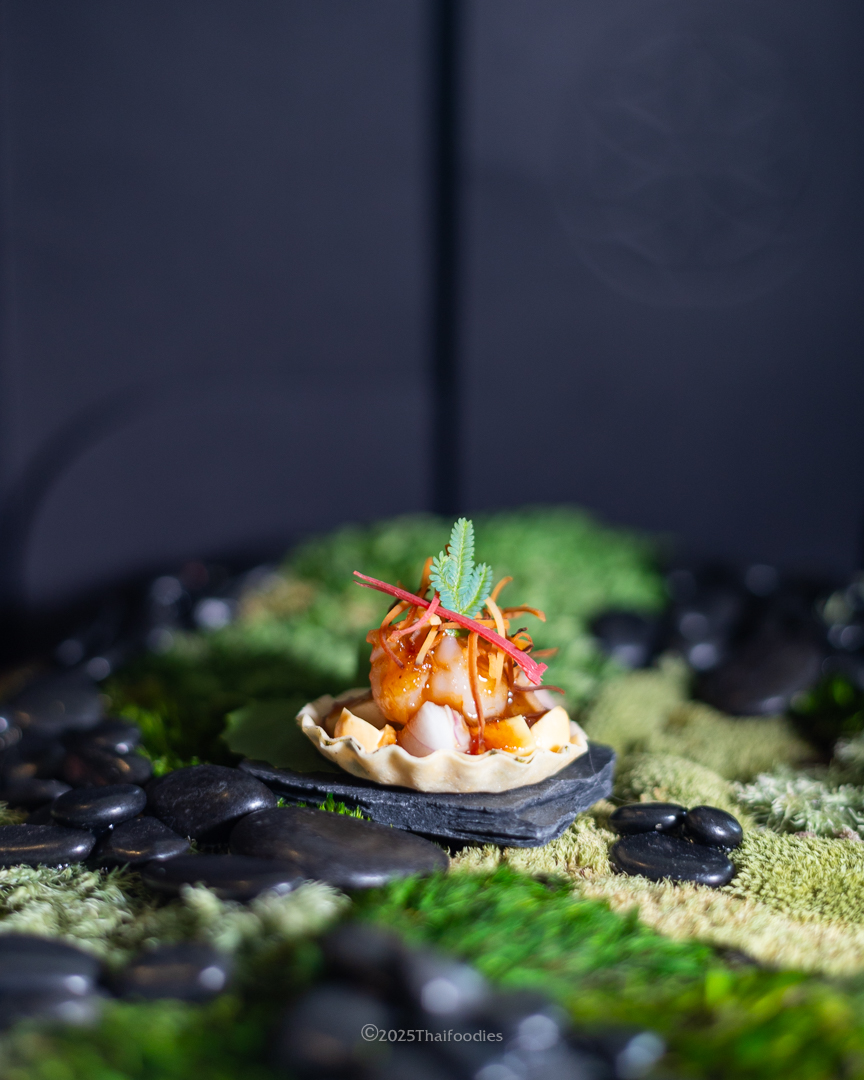 - Young Coconut Grilled Chili Scallops – plump scallops grilled to perfection, topped with house-made chili paste, sea urchin, young coconut, and lychee, garnished with crunchy baby bell peppers
