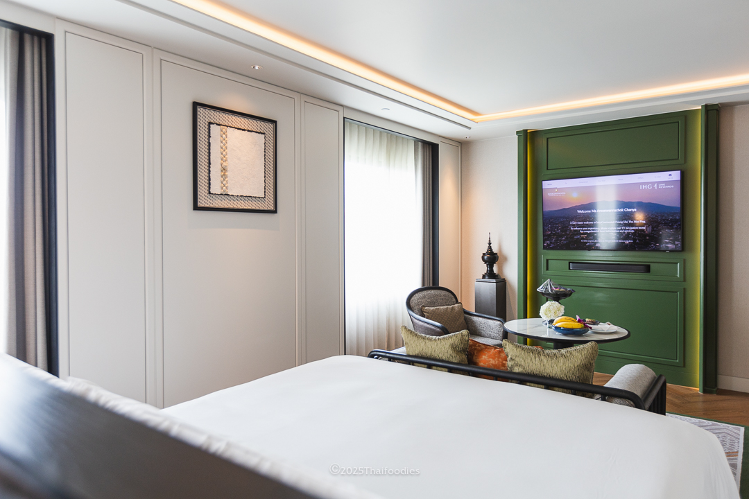 Your journey begins the moment you step into the King Premium Mountain View room. Designed with relaxation in mind, it features a plush bed, cozy seating area, and a fully equipped workspace. Unwind with tea, coffee, and locally inspired snacks while enjoying your favorite show on the TV—or simply gaze out at the majestic white chedi of Wat Chedi Luang, right from your window.