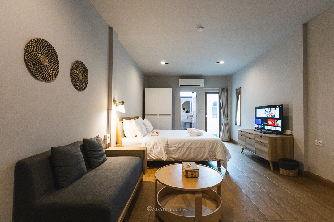 - Relaxation area: There's a small sofa table where you can sit, sip tea, or read a book.