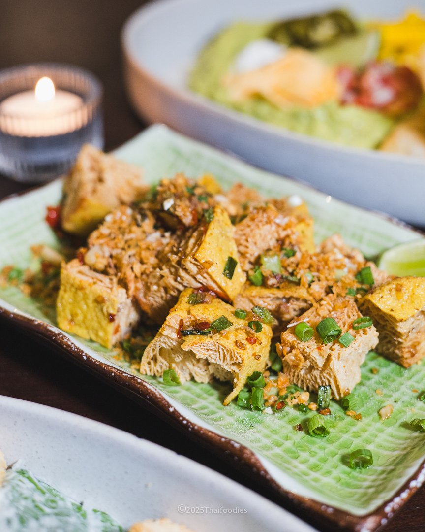 • Klong Ngae Tofu Chili & Salt (140 THB)Crispy tofu stir-fried with chili, salt, and garlic. Slightly spicy, super chilli aromatic, and incredibly addictive.