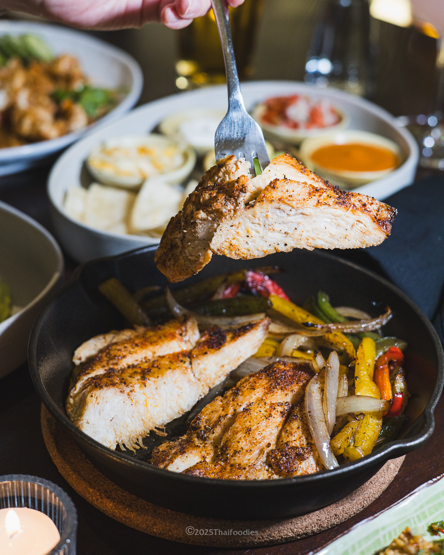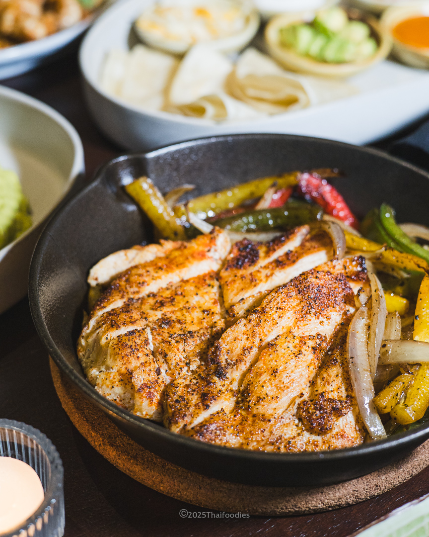 • Chicken Fajitas (420 THB)Sizzling skillet with tender chicken, bell peppers, onions, warm tortillas, salsa, guacamole, sour cream, and cheddar cheese. Wrap it all together for perfection!
