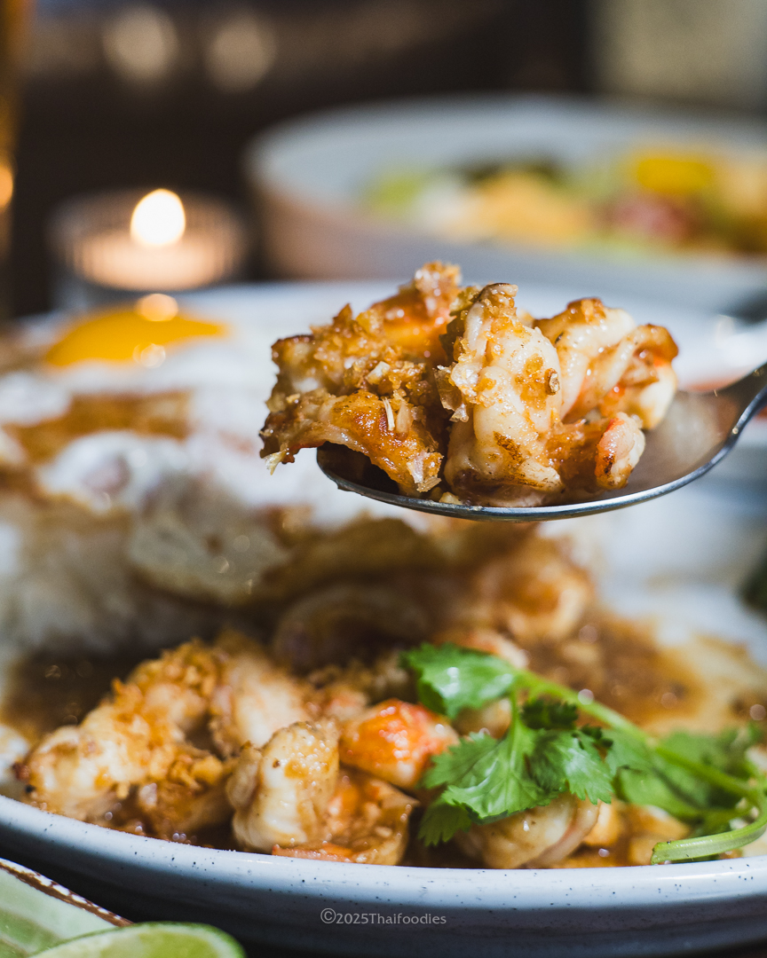 • Stir-Fried Garlic Prawns with Fried Egg (280 THB)Fragrant, flavorful, and perfect with rice — a comforting Thai favorite.
