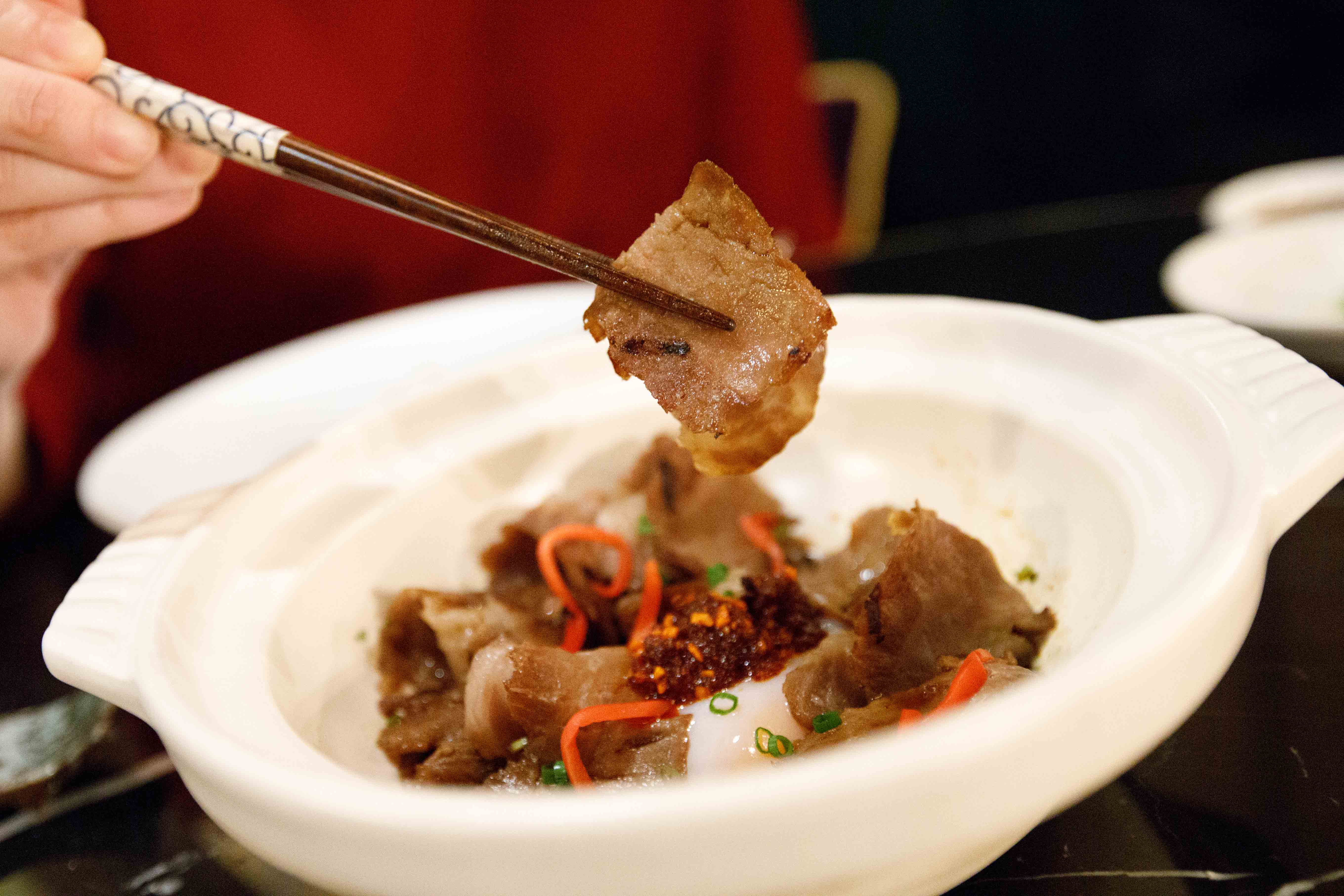 "Iberico Pluma Grilled" with salt served with poached egg tender and juicy Iberico pork full flavor with sauce!