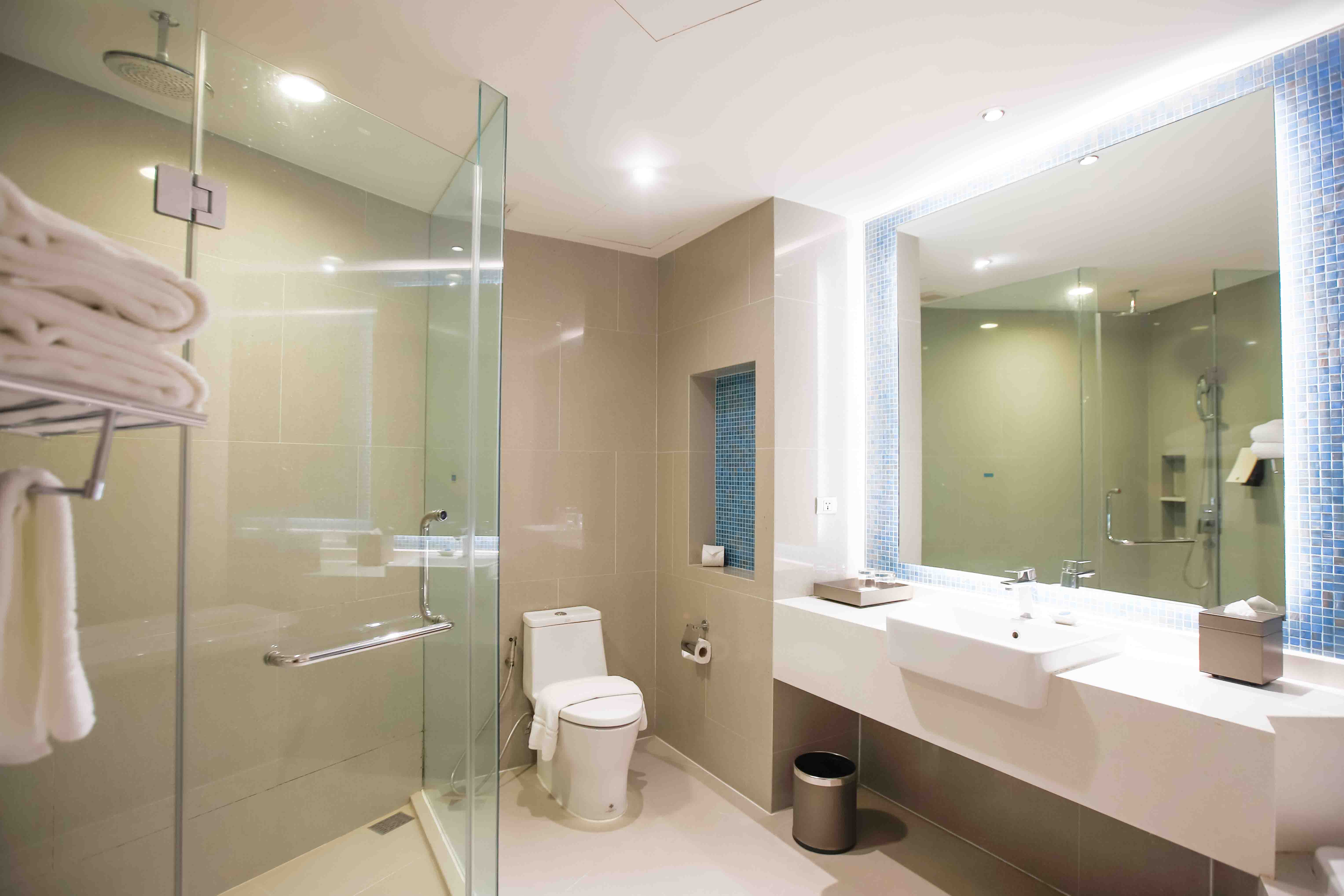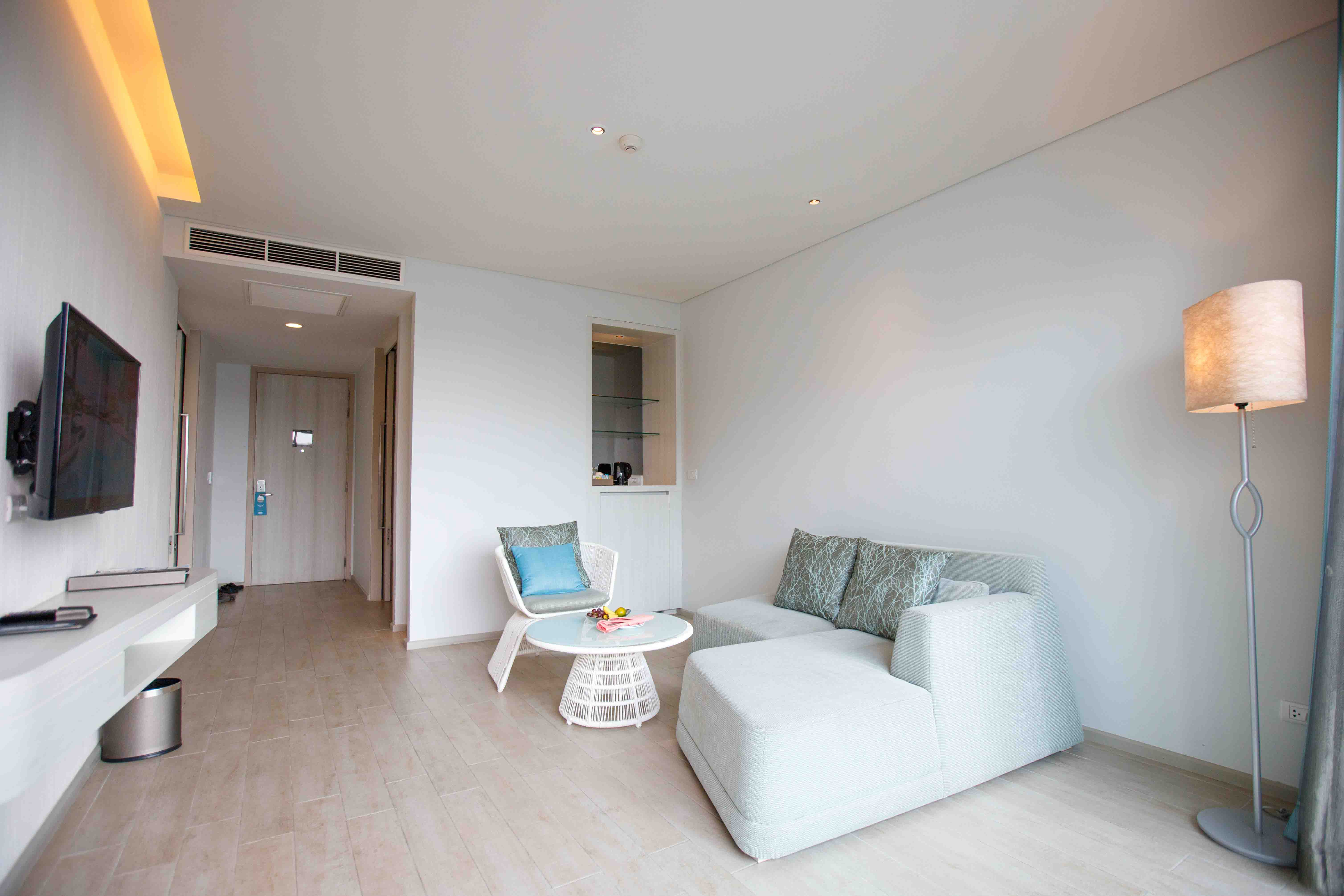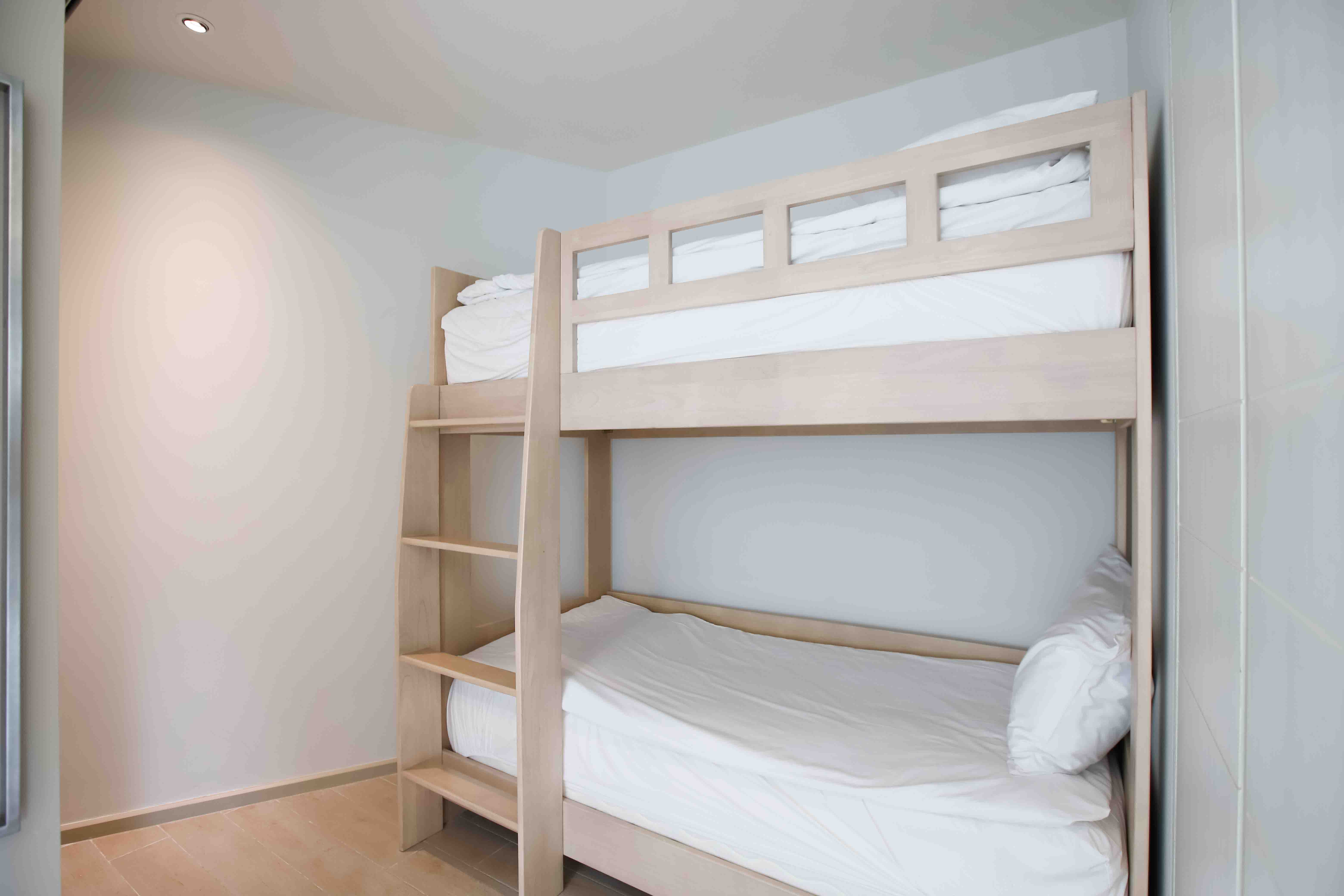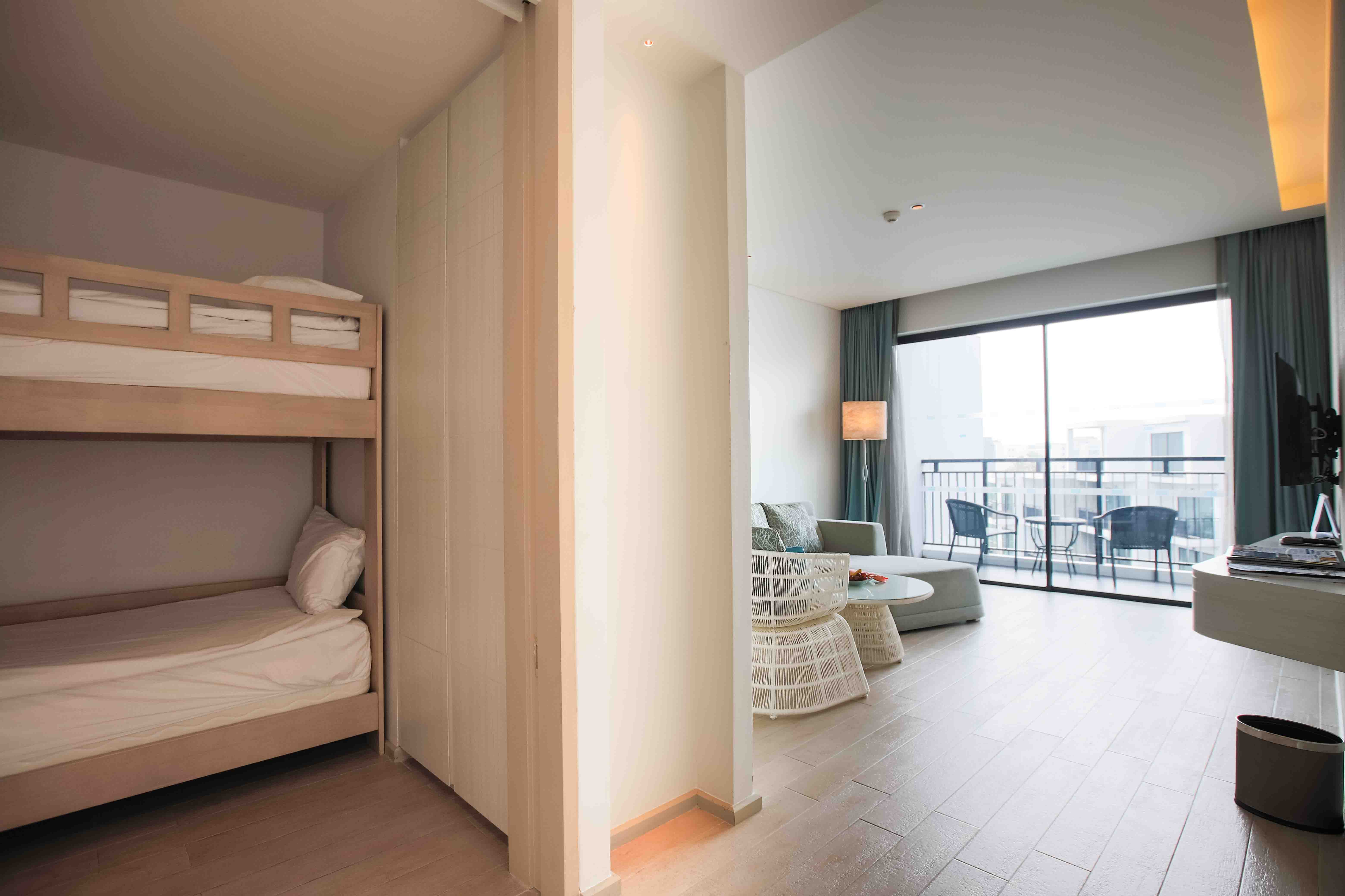 "Family Residence" (3,700 THB) great for up to stay 5 people (with 1 extra bed) this room type features 2 bedrooms (one big bedroom with a king bed) (another smaller room with bunk beds for kids (kids under 12 years) with separate living room area with Tv, and 2 balconies. The spacious bathroom contains has a separate bathtub with bathroom. Still water daily but Ice is not included.