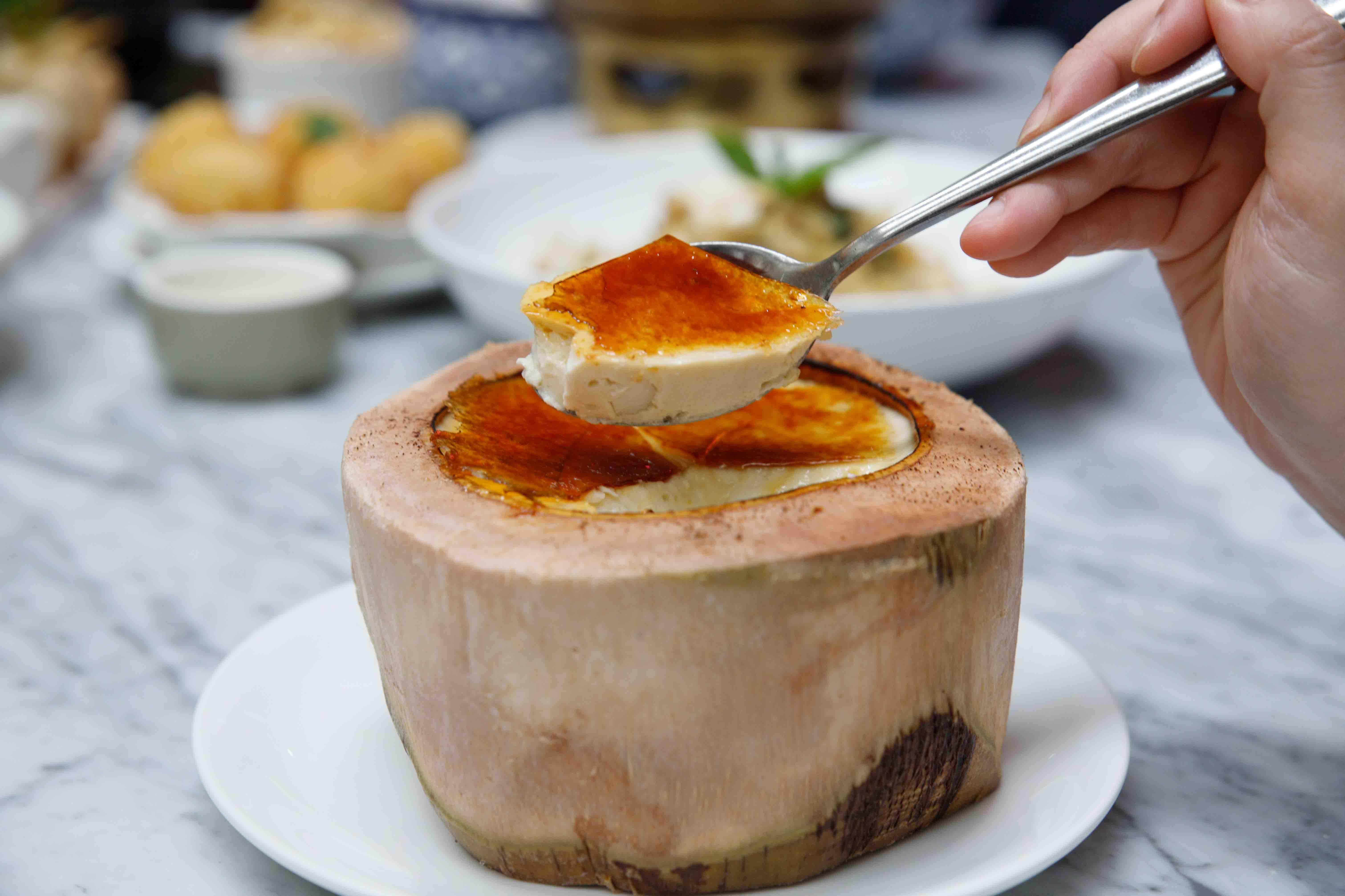 End your meal with a scrumptious dessert Coconut Creme brulee caramelized sugar burnt with custard mixed with coconut this menu is the yummiest creme brûlée ever!