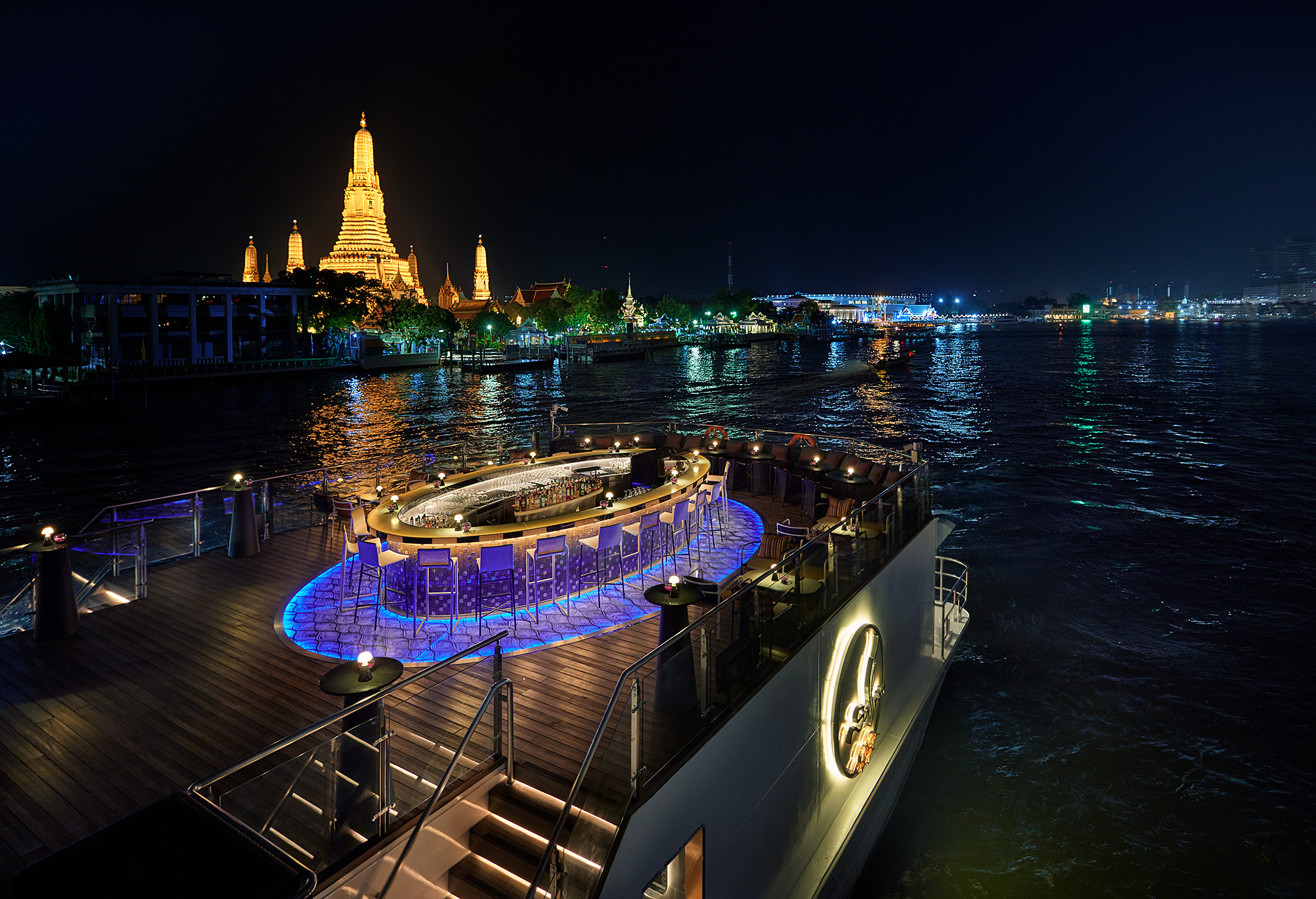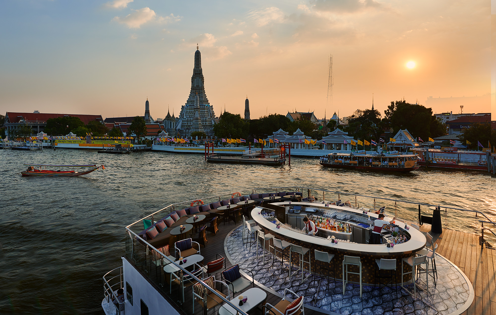 The cruise takes guests along the Chao Phraya and its heritage-rich list of popular riverside cultural sites and attractions, including Wat Arun/Temple of Dawn, The Grand Palace, Asiatique, vintage Royal Barge Museum, plus many other fascinating facets of Bangkok as viewed from this unique, floating perspective. On-board ambience includes live entertainment and cultural performance. Additionally, Saffron Cruise is the only leisure river cruise service that offers MICE hosting, including business and trade group meetings and company incentive events. Private charter packages include cooking classes, tailored spa