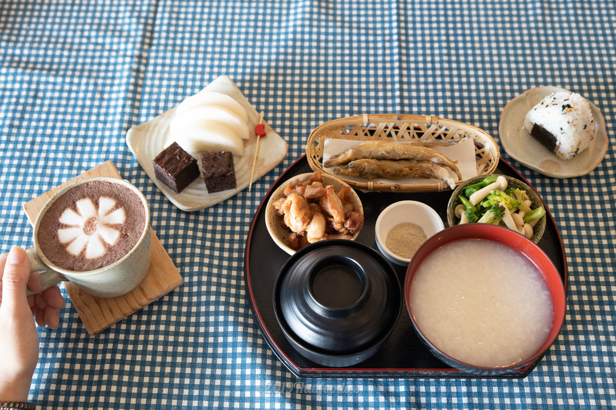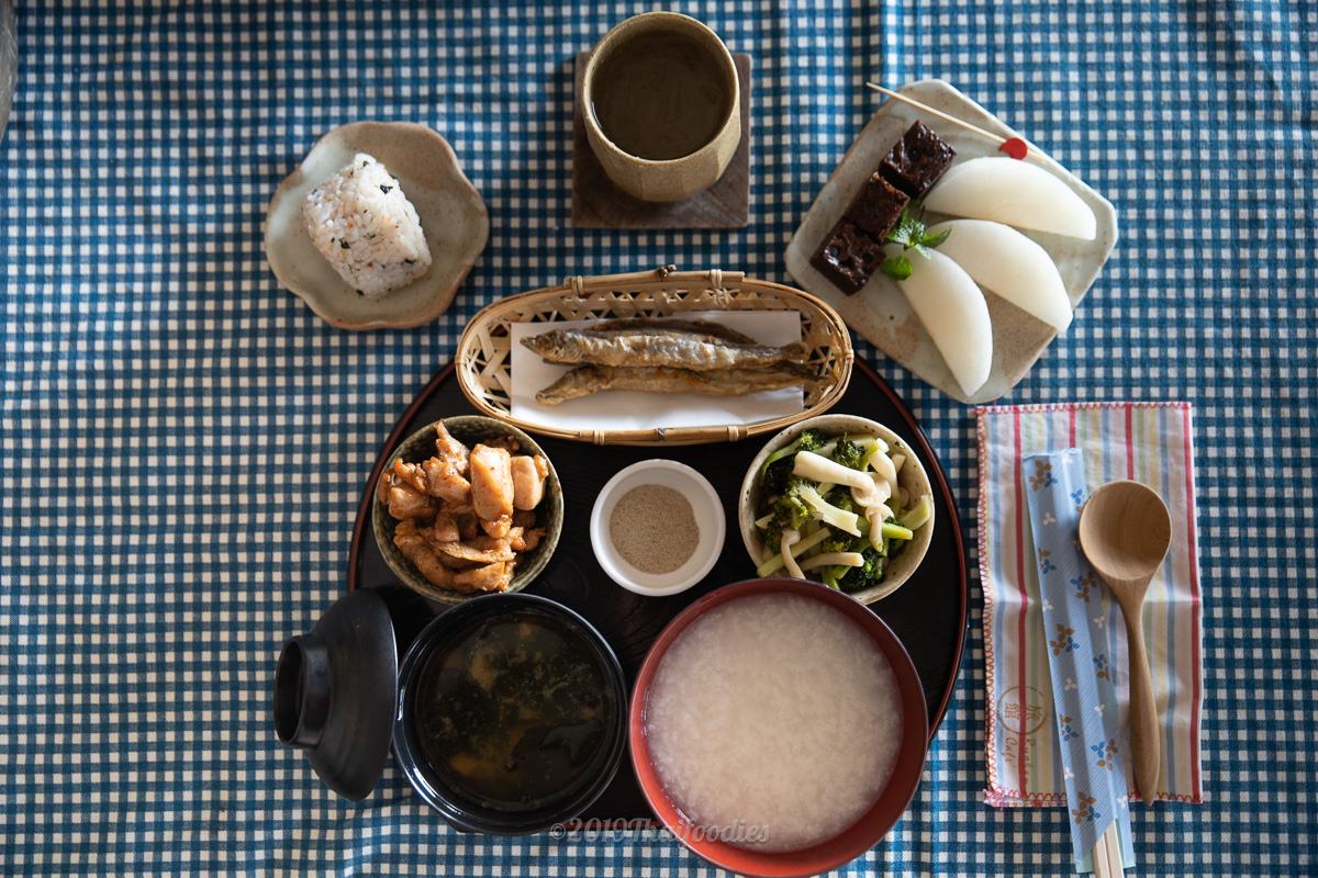 They will serve you your a choice of coffee and porridge, served with deep fried shishamo (egg fish), Chicken stir fry with soy sauce and miso soup.