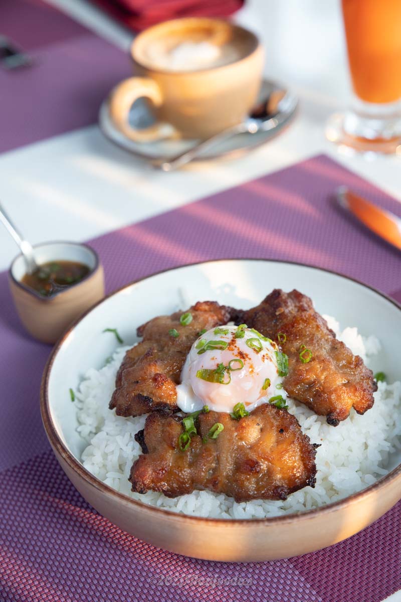 Try the Grilled Pork Bowl served with slow cooked egg the pork is sweet and grilled perfectly to eat with slow cooked egg.