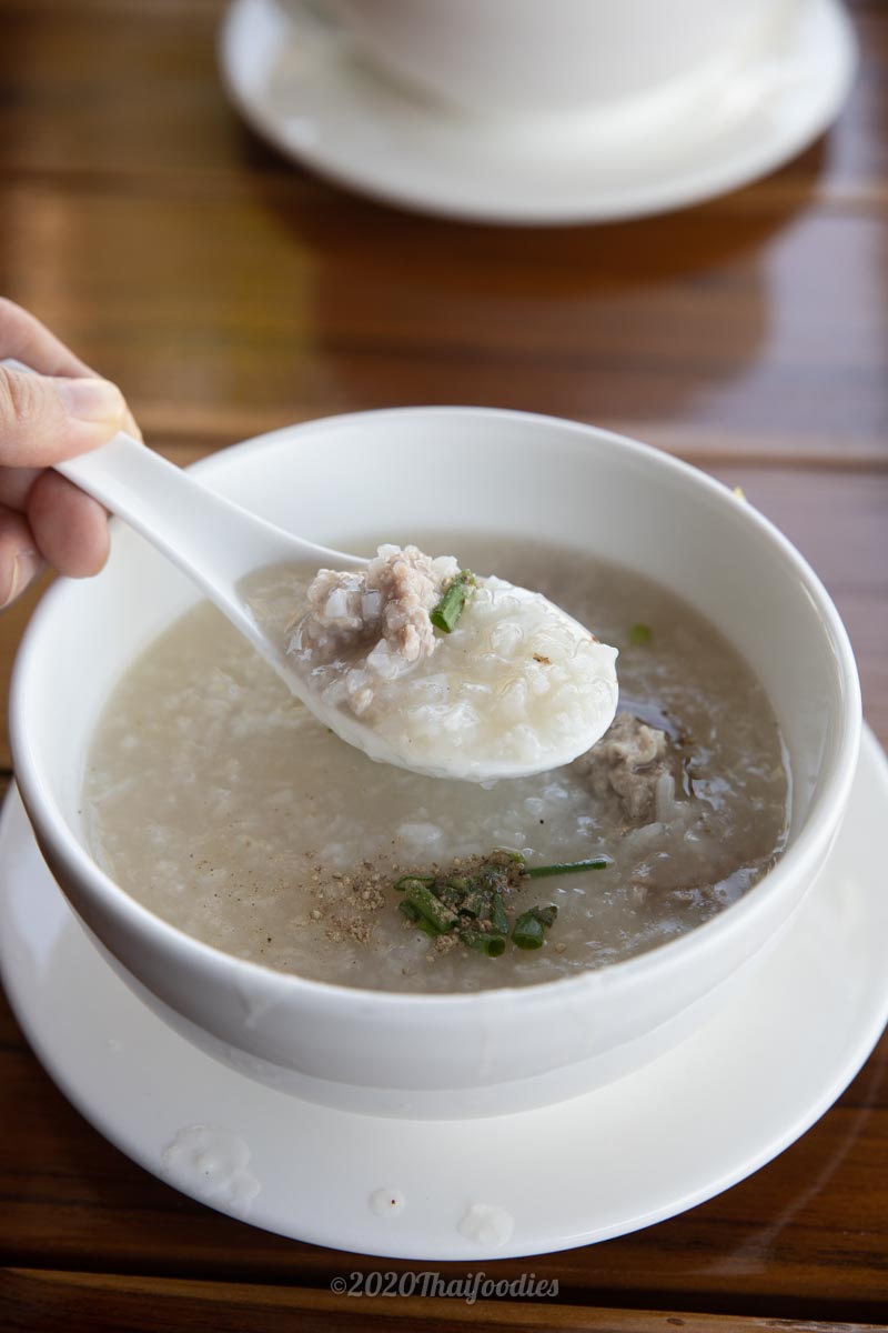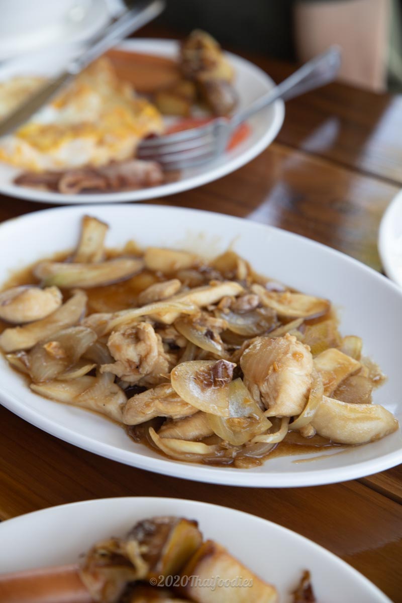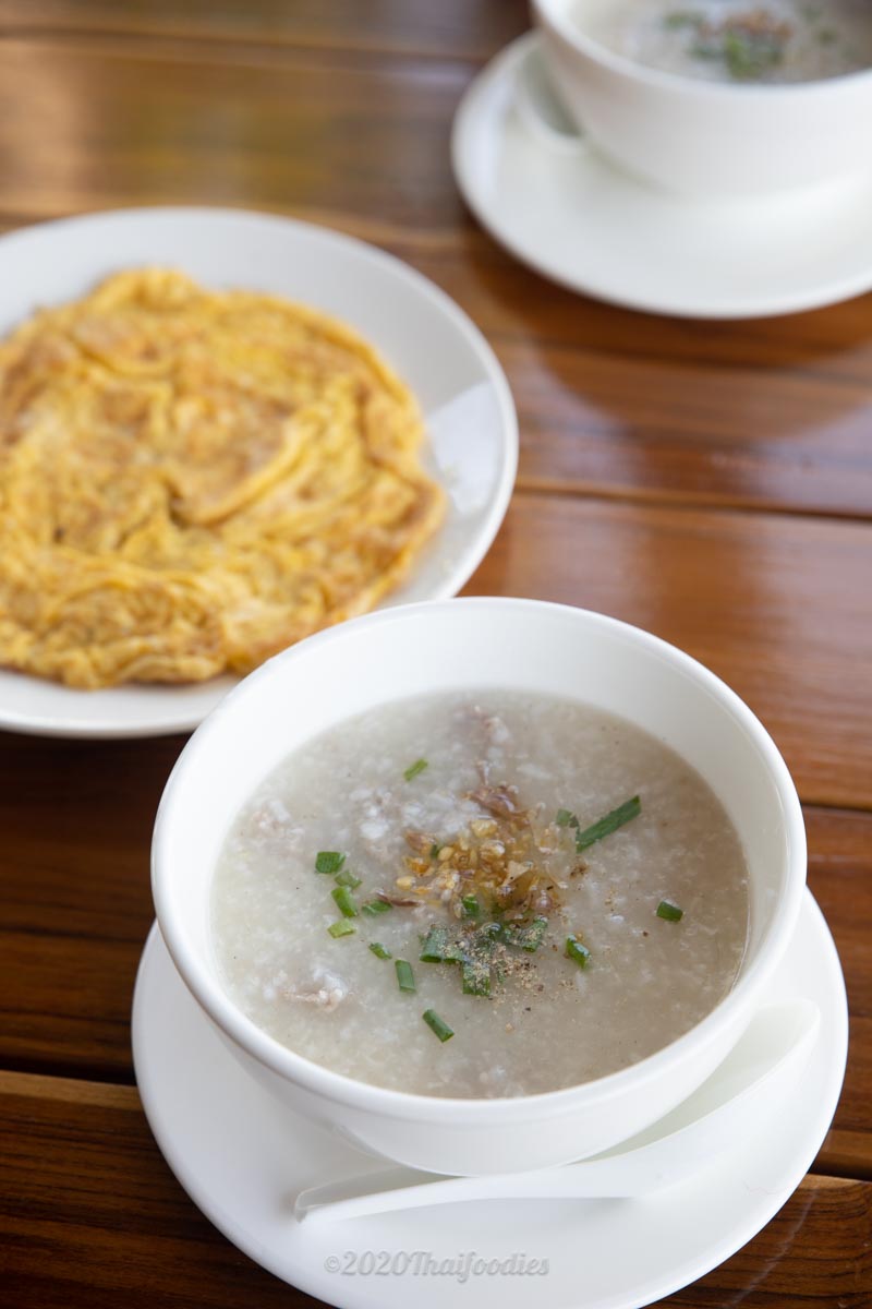 On offer is a selection of Pork porridge, congee, with Chicken stir fry with oyster sauce and onion, Omelets, or Sunny side up eggs with toasted bread and croissants. Coffee and Orange juice are ready when you are.