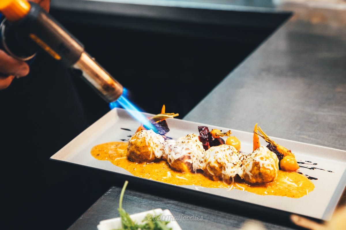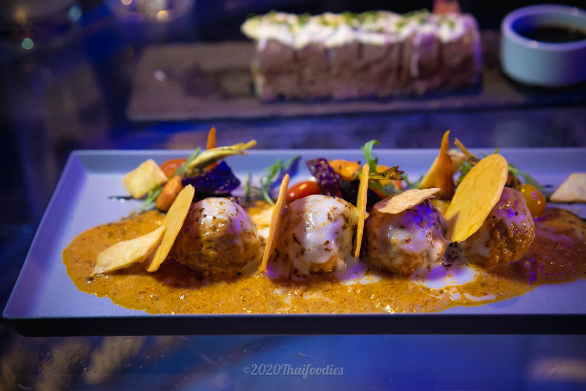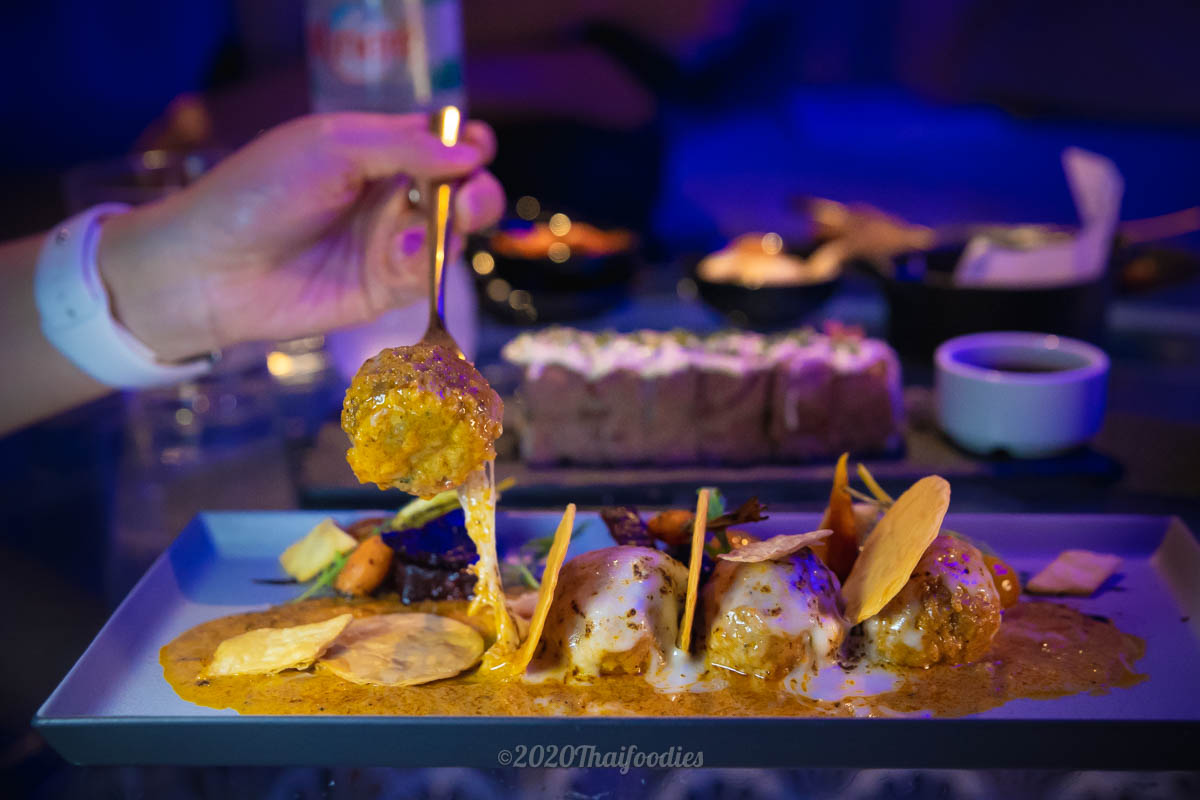 Mussamun meat balls along with melted cheese and curry.