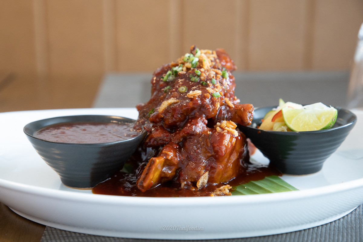Barbecue sticky ribs : Maceration tender pork ribs with juicy barbecue sauce top up with fried red shallots.