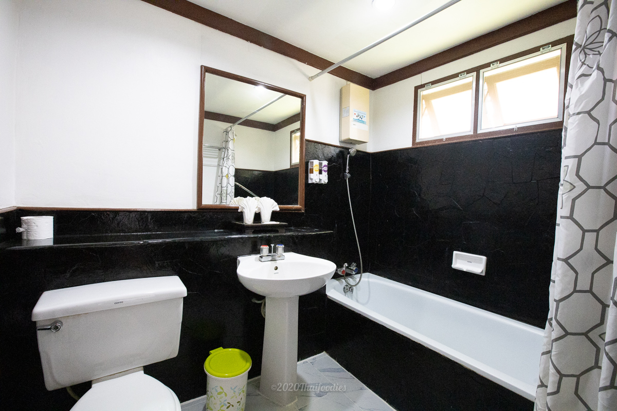 The bathroom is clean with a full bath and free shampoo and shower bath gel. Room service and still water are ready to serve.