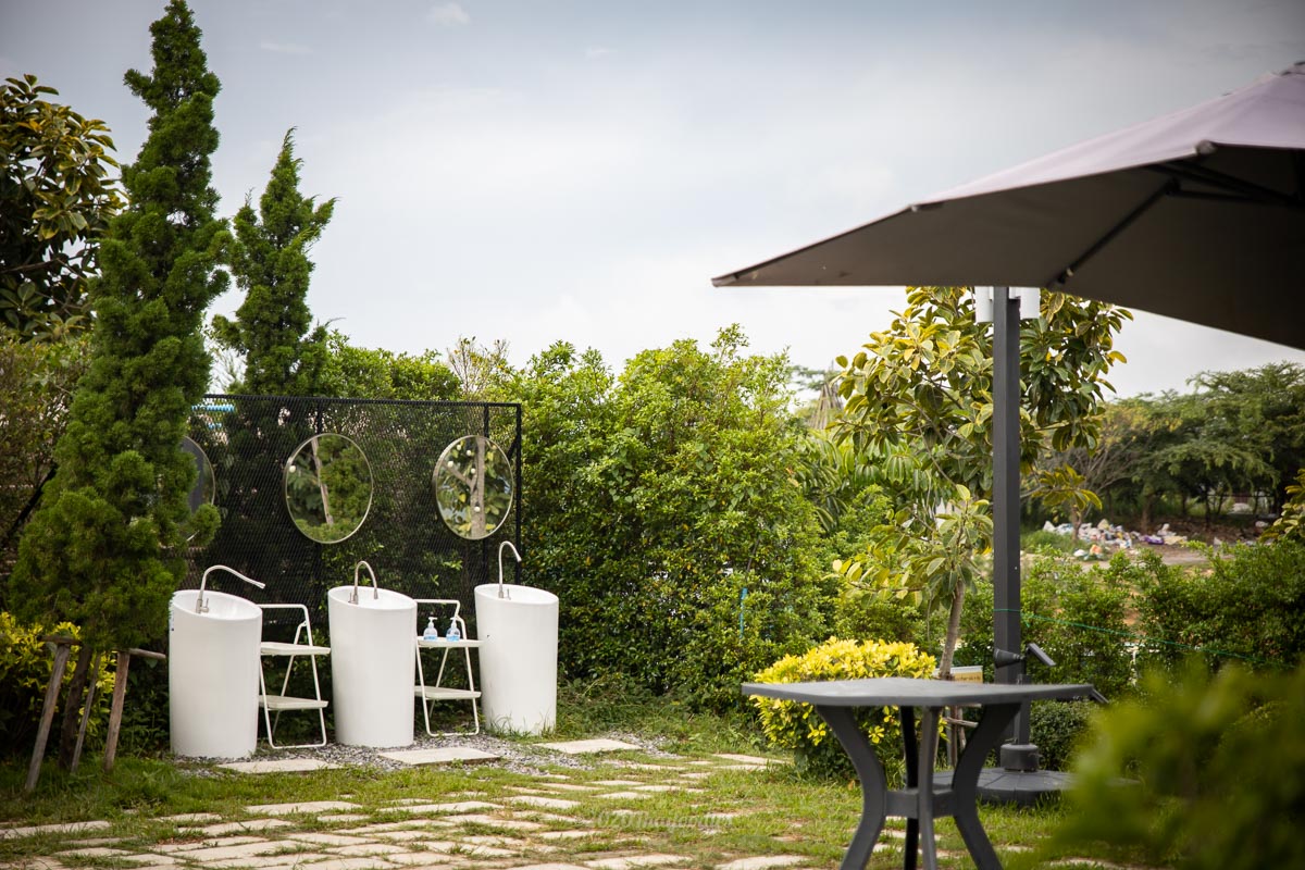 a dining table is set up in front of your tent, and staff will start to prepare the huge set that includes 2 kinds of pork, vegetables, and 6 sticks of barbecue pork, with 3 kinds of spicy sauce - yummy!
