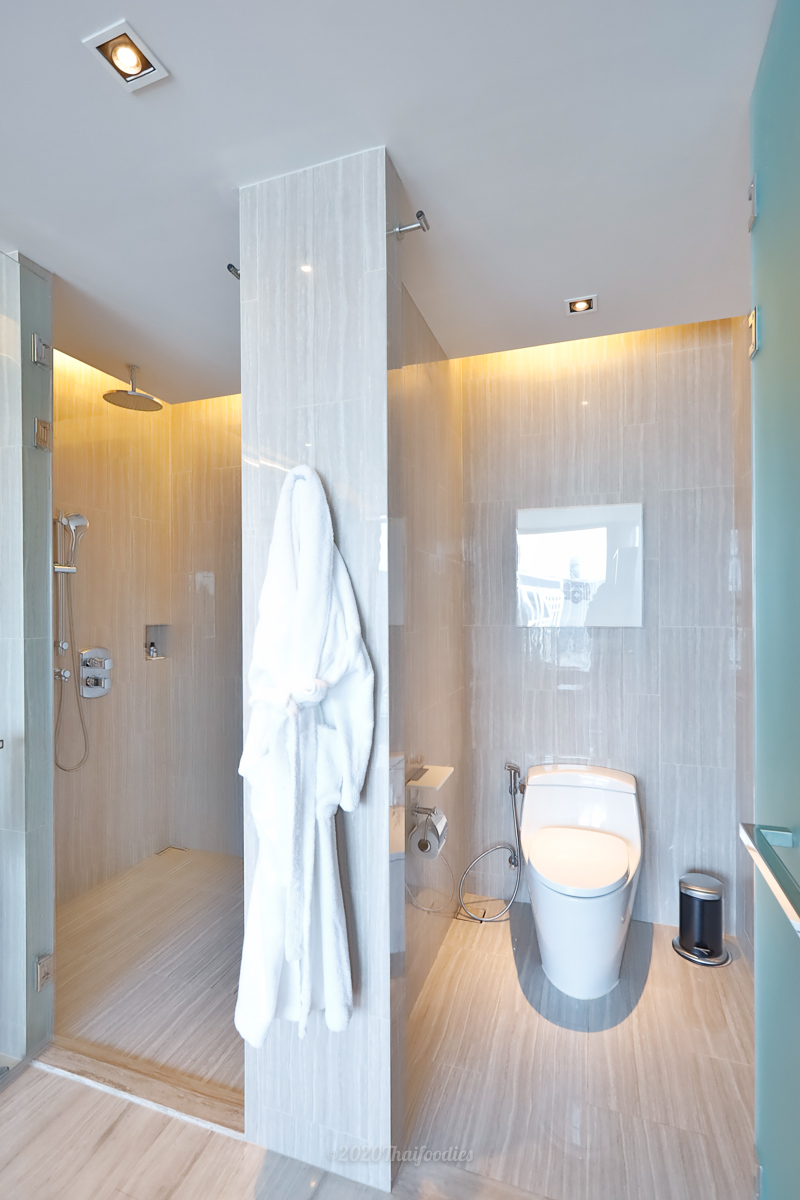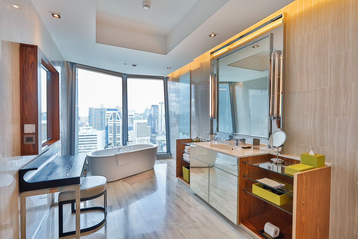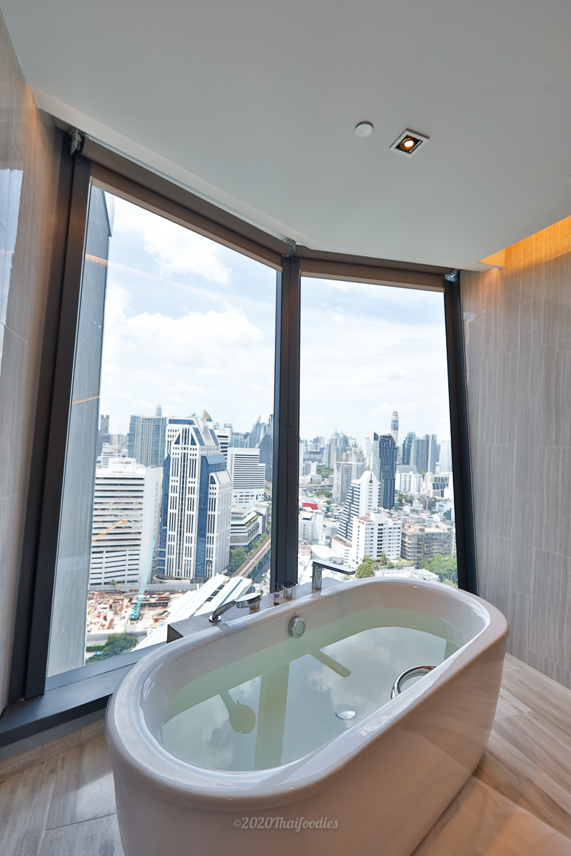 The big bathroom includes a full bathtub with a big window you can enjoy bathing while enjoying a Bangkok city view