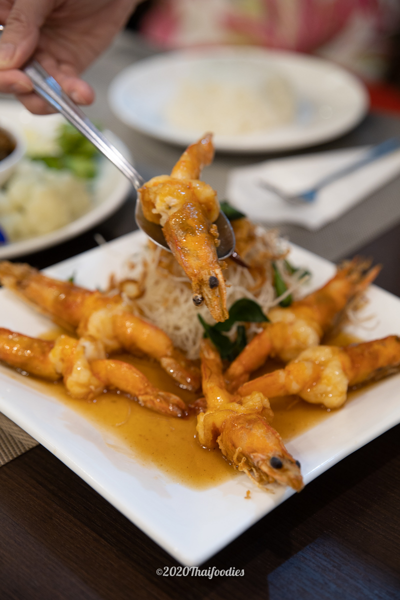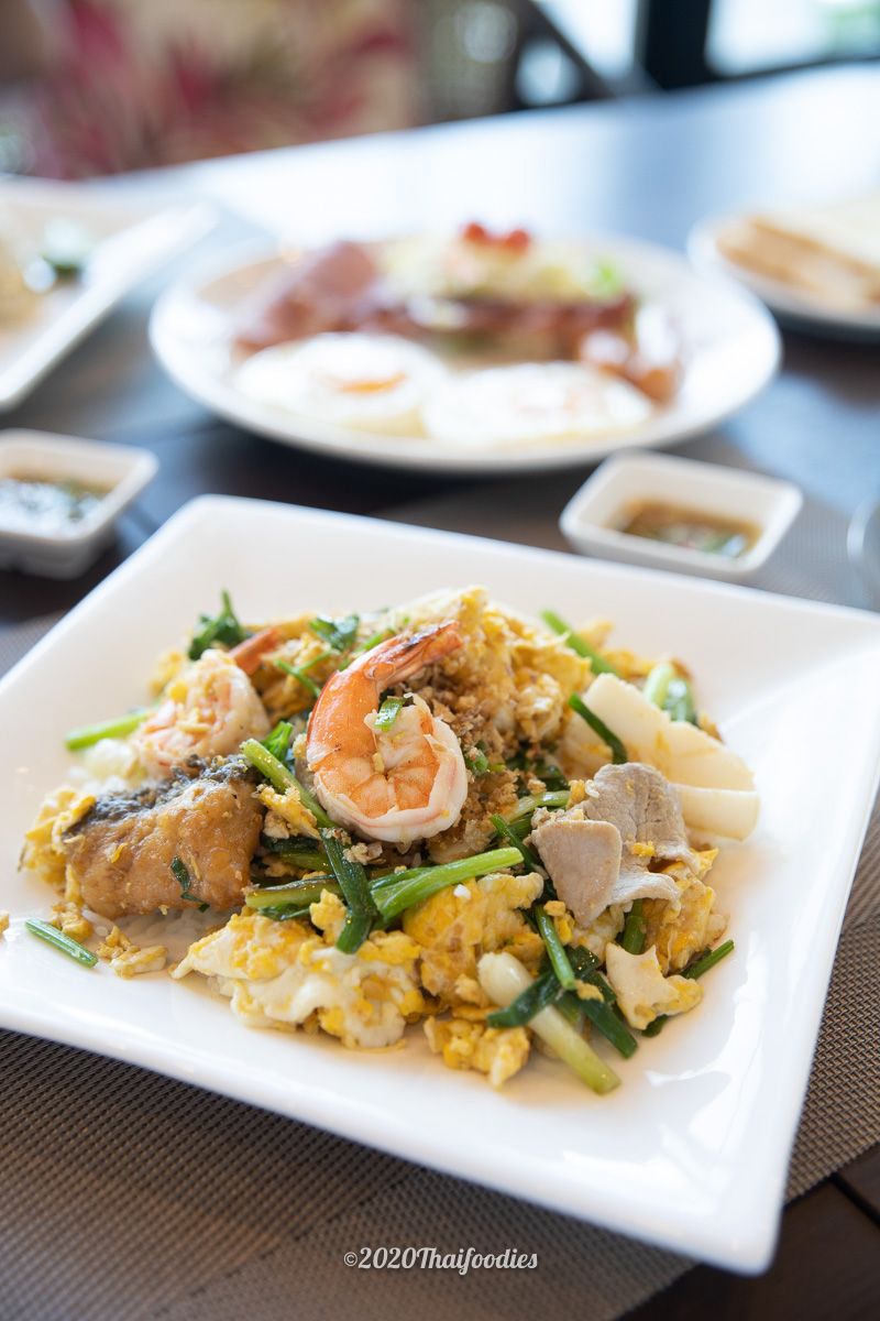 We recommend, "Jasmine Rice topped with mixed seafood" (Khaotom Hang) with soy sauce and fried garlic, the huge prawns, and fresh sea bass dip with salted soya bean sauce.