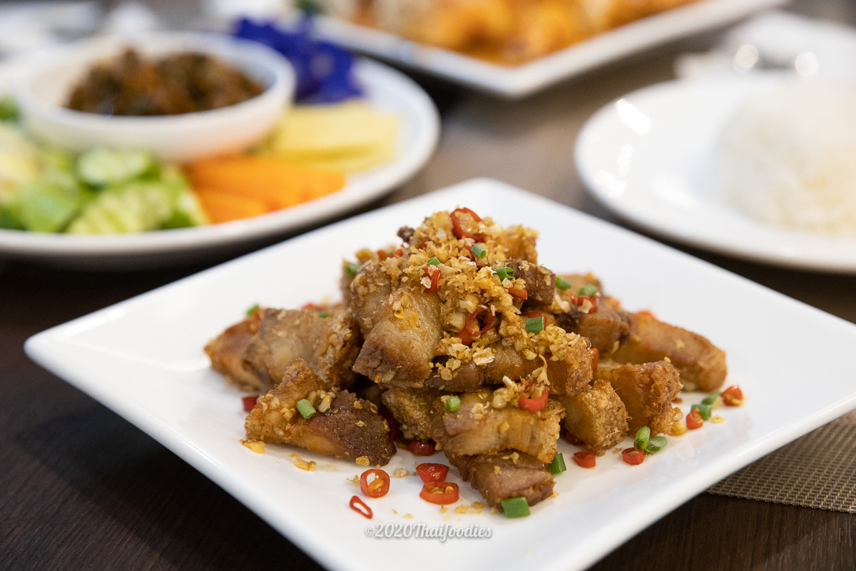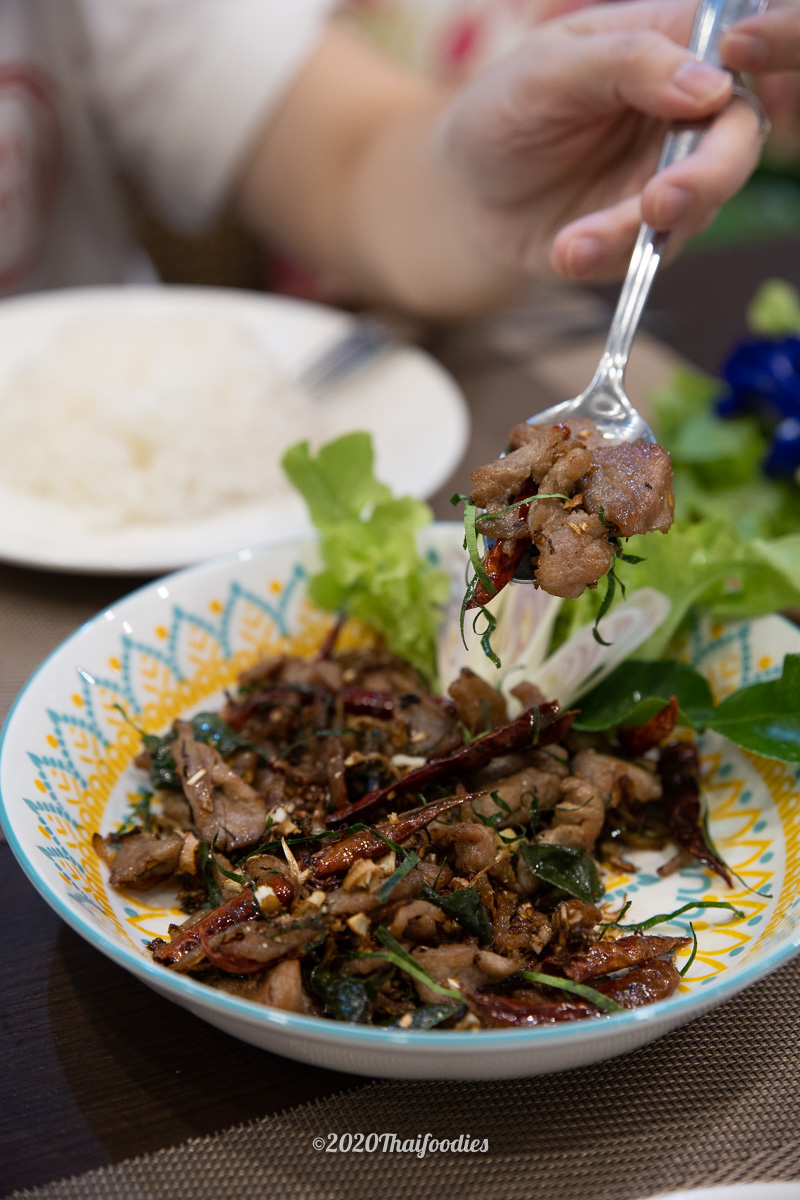 Crispy pork belly stir fry with chili and garlic