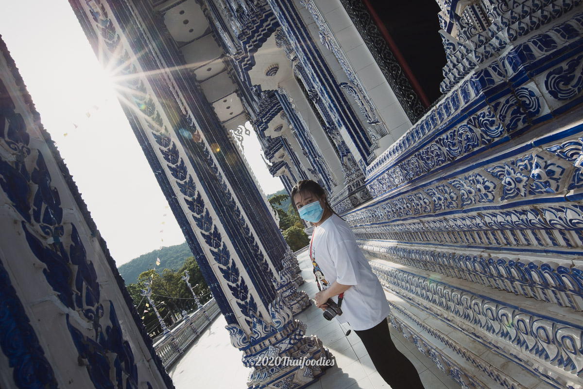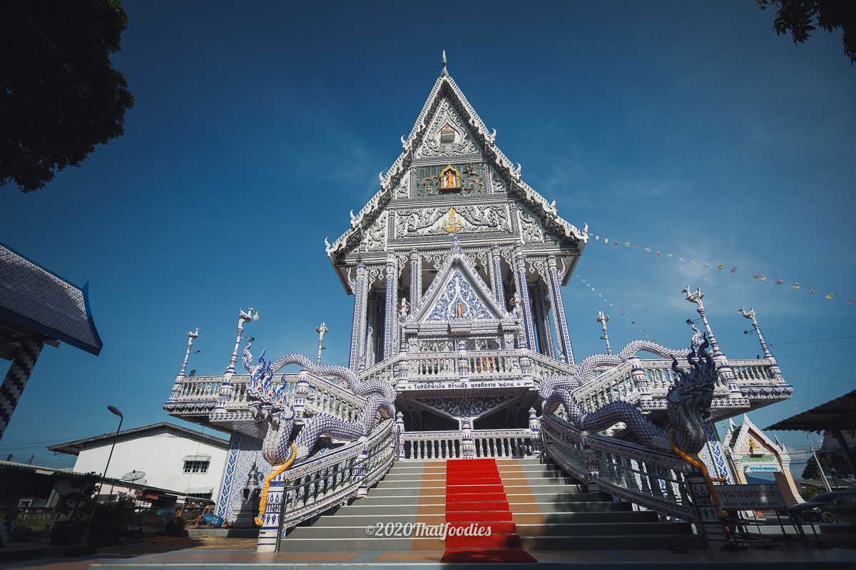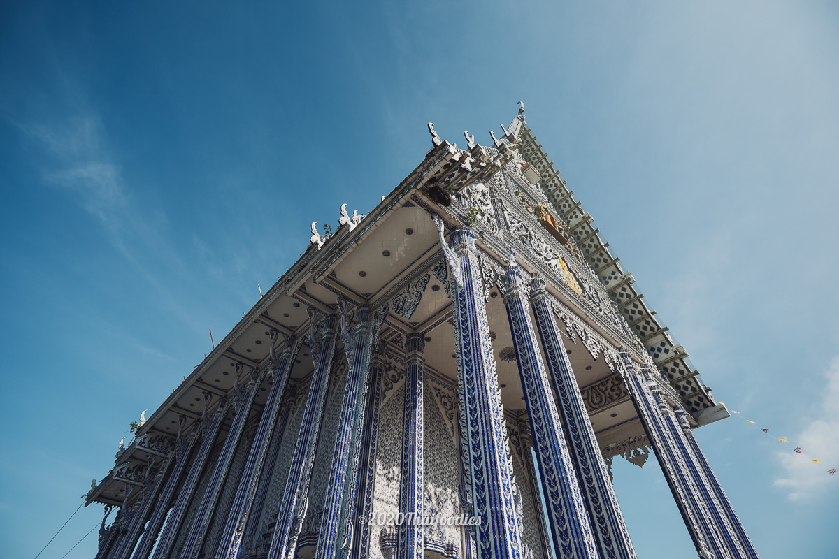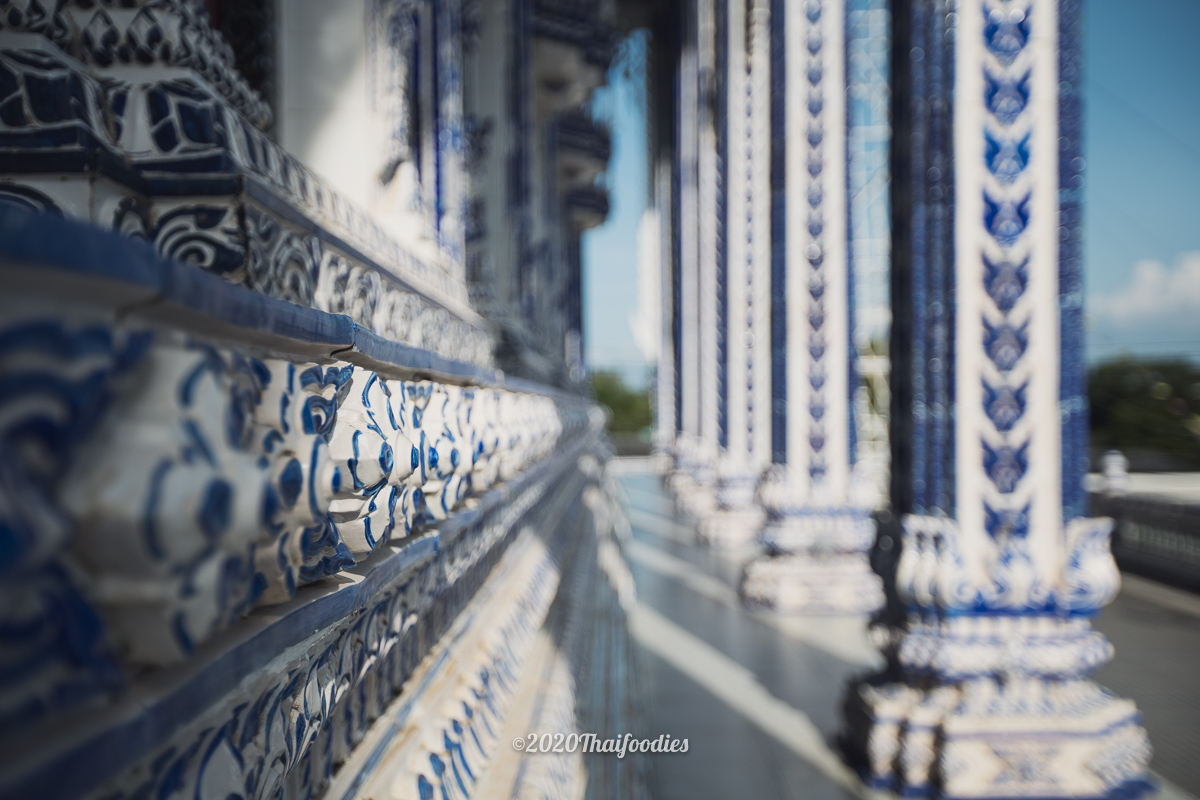 After we checked in we decided to drive to a famous art temple at "Wat Paknam Khaem Nu" The huge temple is constructed from dark blue ceramics and you can go to make respect and pray inside the temple
