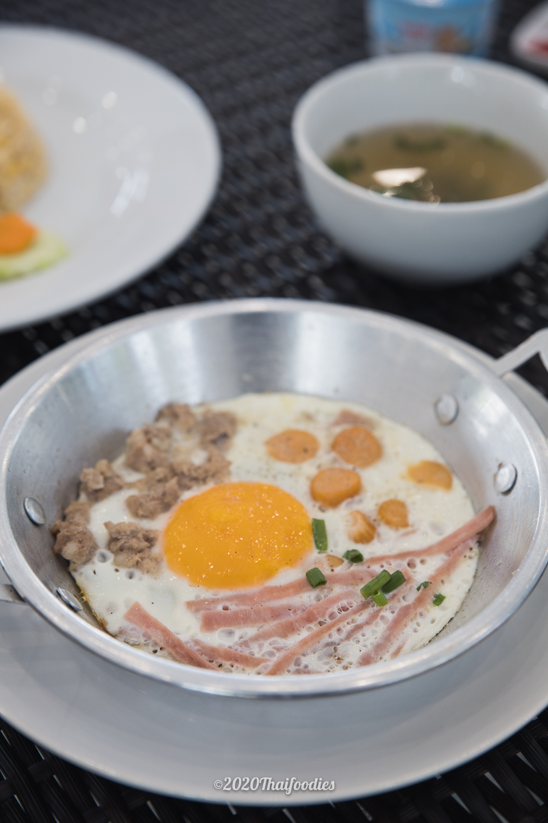 Pork boiled rice, Prawn boiled rice, Omelets served along with sausages, and toasted bread. All staff wears a mask, face shield, and gloves during the covid19 situation.