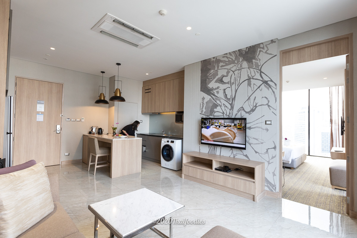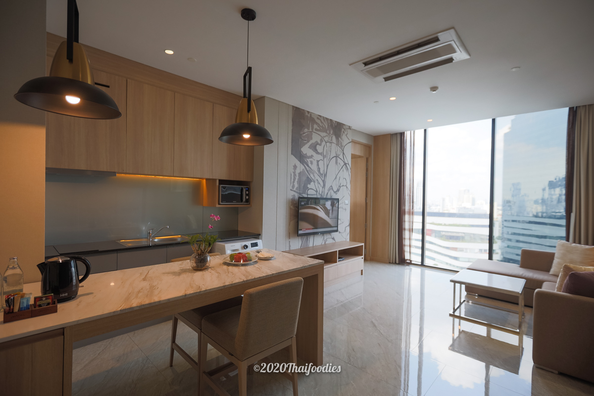 A fantastic hotel located in the heart of Bangkok city, Sky View Hotel Bangkok! Located right next to the chic Emporium shopping center off the BTS Sky Train Prompong station this hotel is modern and oh so convenient! We stayed in a Sky View Executive Suite, a 62sqm room with a full kitchen area, dining table and including all kitchenware with a washing machine, a big living room with 2 televisions, a comfy king-size bed (6.5 ft), working desk,
