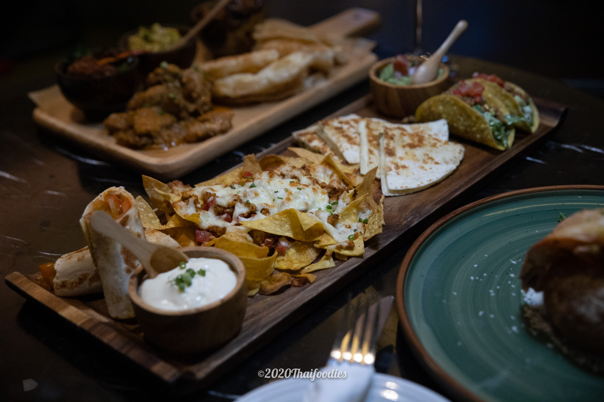Peruana de México; A yummy mix of Mexican delights: Taco salad, Nachos, Quesadillas, and Fajitas with tomatoes salsa, serve with sour cream and guacamole