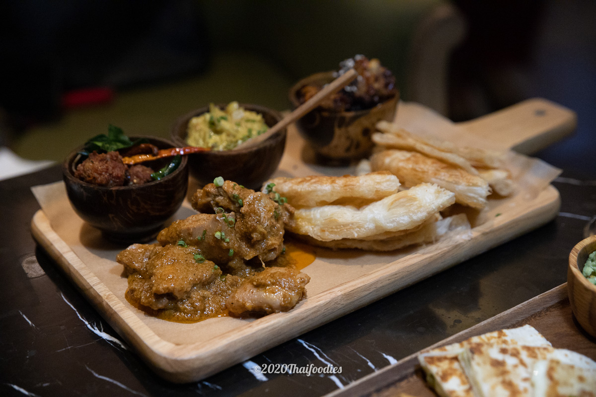 Barrio Asia platter; a perfect combination set comes along with Chicken tikka, Chilli crab curry, Crispy lamb in Schezwan sauce, Deep fried pork ball mixed with herbs, and chili served with crispy roti.