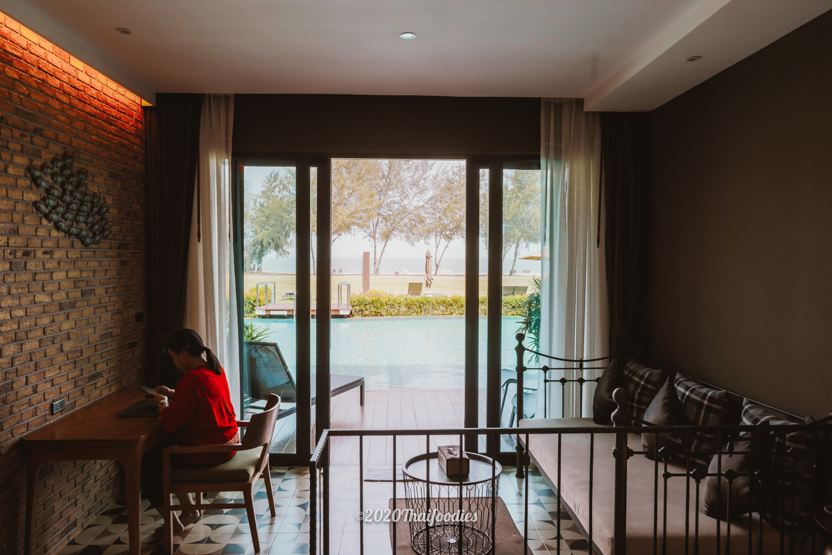 The bedroom has a nice and cool ambiance with full facilities and a sitting area with a pool view.