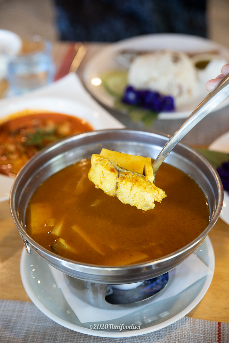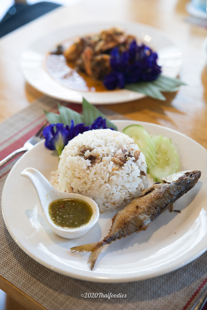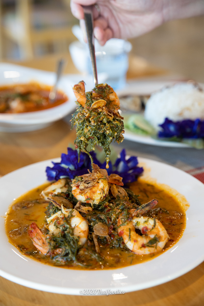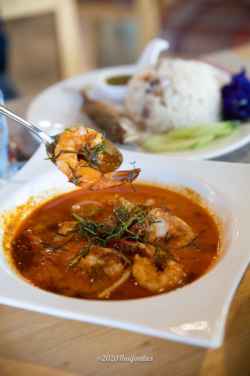 Fried rice with Mackerel fish Spicy and sour prawns salad with Cha-kram leaves Red curry with deep-fried shrimps