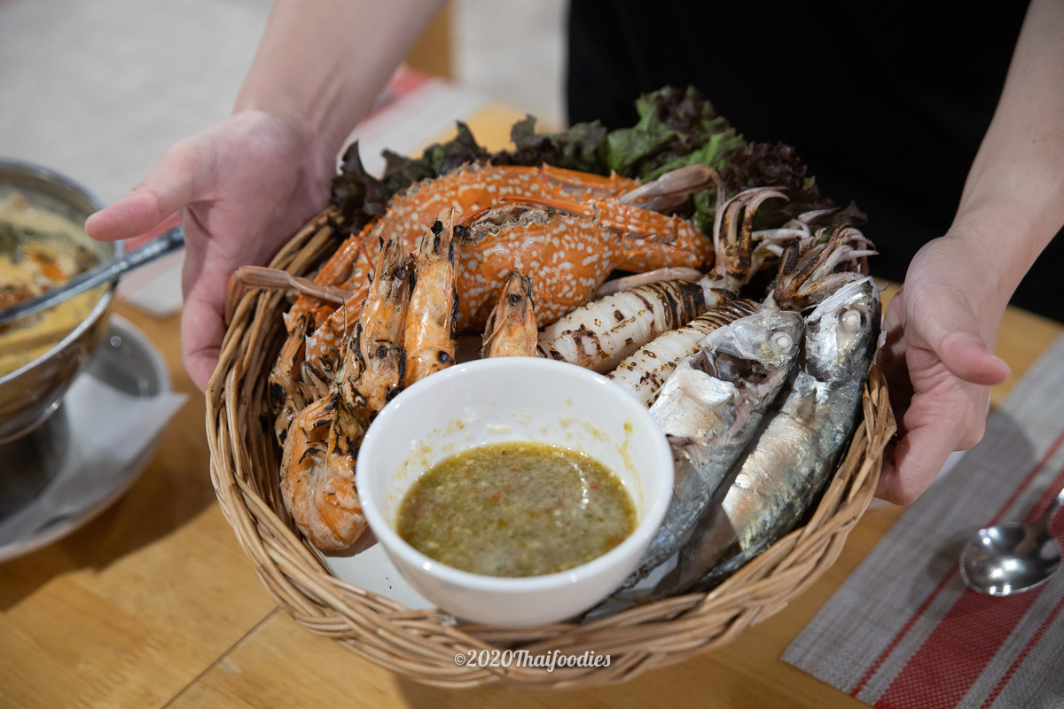 Mixed grilled fresh seafood (Grilled blue crab, Mackerel fish, Tiger prawns)